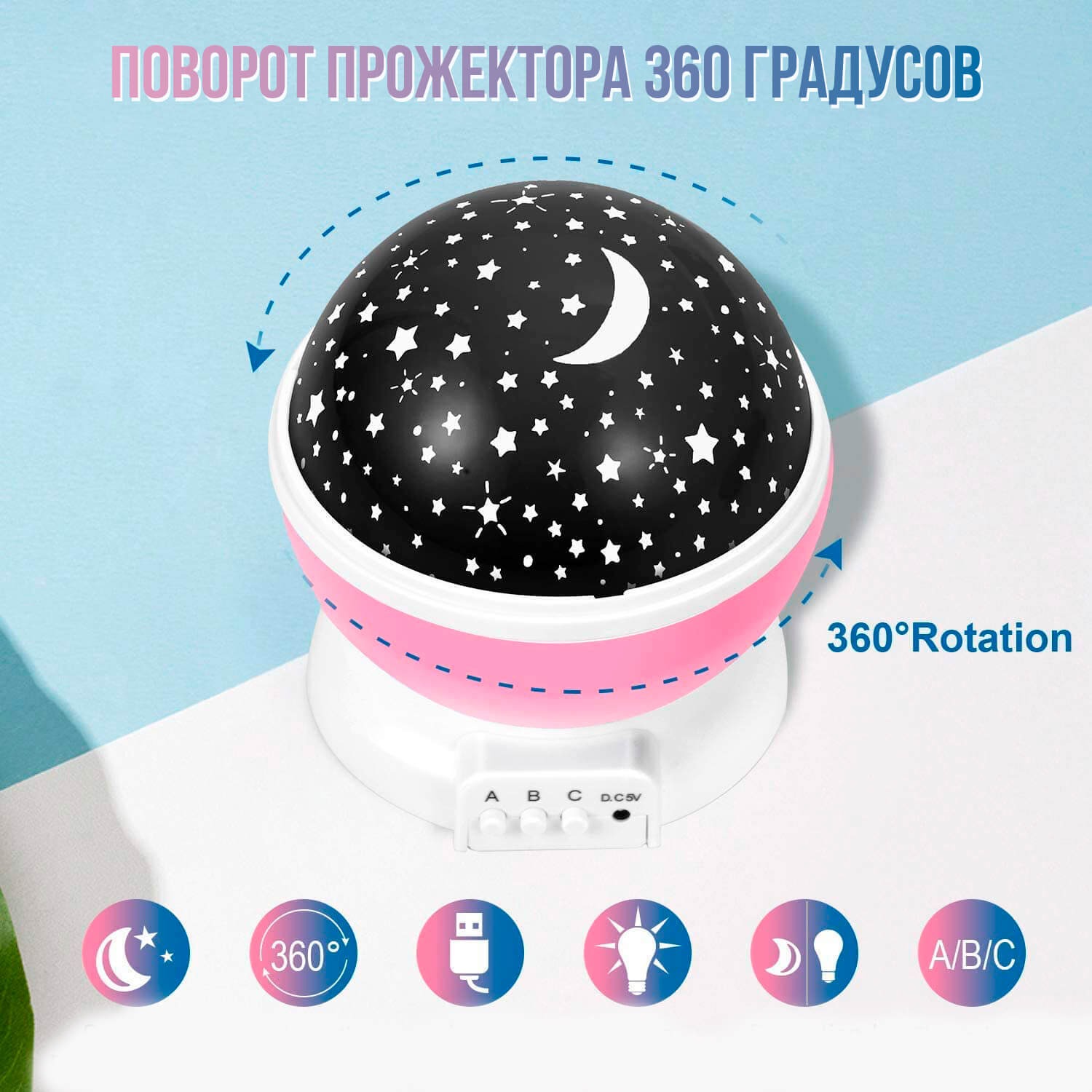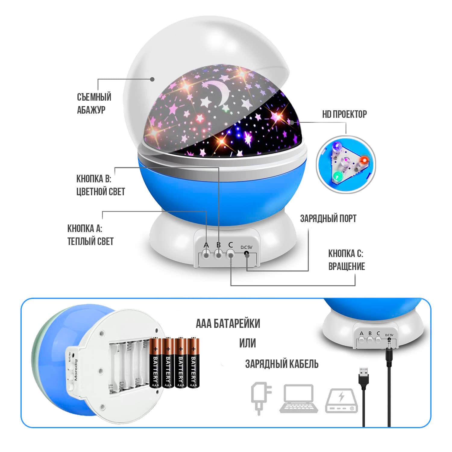 Режимы работы: 3 кнопки (вращение, белый свет, разноцветное свечение) Напряжение: 5 В Питание: USB-кабель или от батареек АAА 4 шт Материал: пластик Детский ночник - это, пожалуй, один из самых интересных подарков для детей любого возраста. Светильник создаст в комнате сказочную атмосферу для интересных игр, поможет ребенку быстрее уснуть, и особенно понравится деткам, которые боятся оставаться в спальне при выключенном свете.