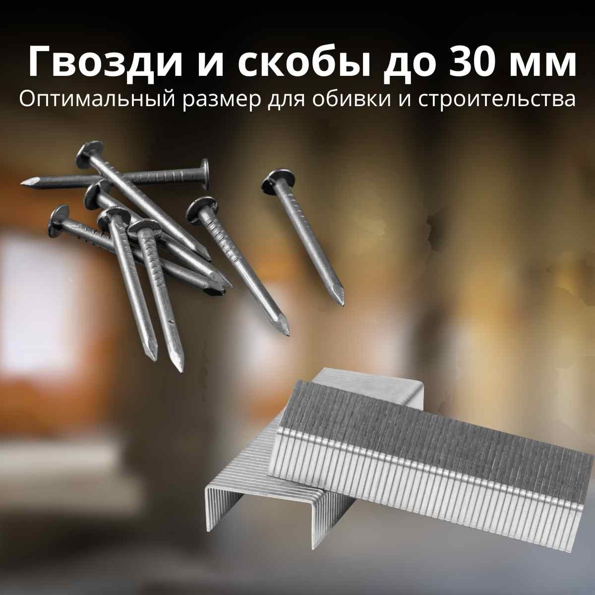 Эргономичный дизайн и небольшой вес делают инструмент удобным даже для работы в труднодоступных местах. В комплект входит прочный кейс, который защитит устройство от повреждений и упростит его транспортировку. Благодаря совместимости с гвоздями длиной до 30 мм, степлер отлично подходит как для обивки мебели, так и для строительства деревянных конструкций.