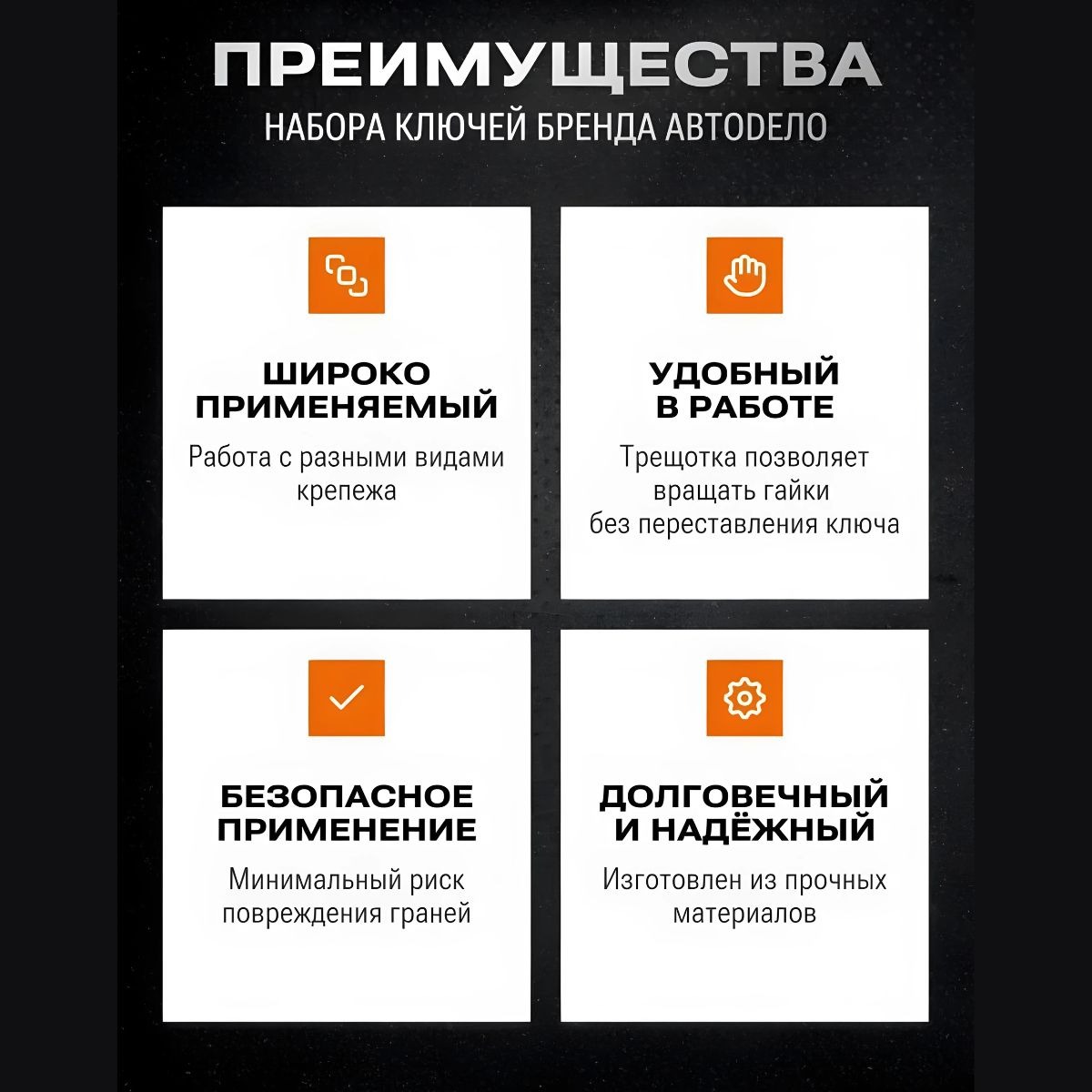 Ключи выполнены из прочной инструментальной стали, имеют хромированное покрытие, устойчивое к коррозии, и оснащены шарнирным механизмом, который обеспечивает удобство работы даже в труднодоступных местах.Трещоточный механизм позволяет работать быстро и эффективно, не снимая ключ с крепежа, что значительно экономит время. Универсальный набор подойдёт для автомастерских, строительных и ремонтных работ.