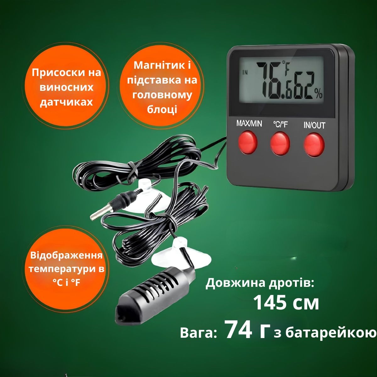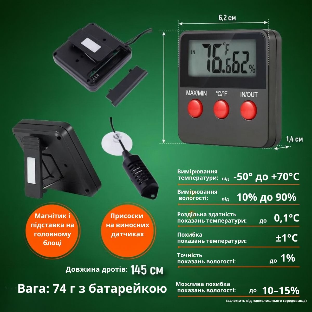 Гигрометр и термометр — это удобное устройство для контроля температуры и влажности как внутри помещения, так и на улице. Благодаря выносному датчику вы можете получать точные показания из нужного места, а большой цифровой дисплей обеспечивает удобное считывание данных. Прибор работает от батареек, что делает его мобильным и практичным в использовании.