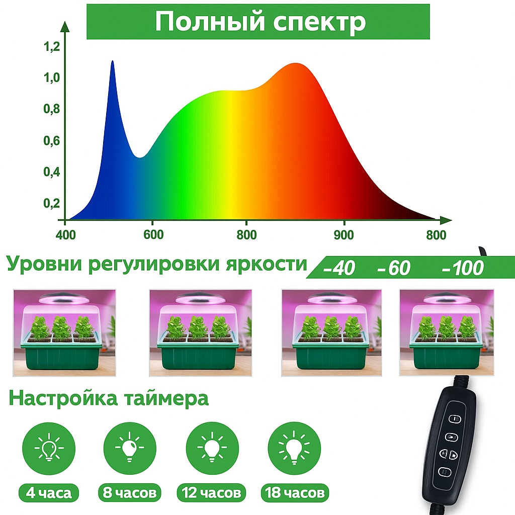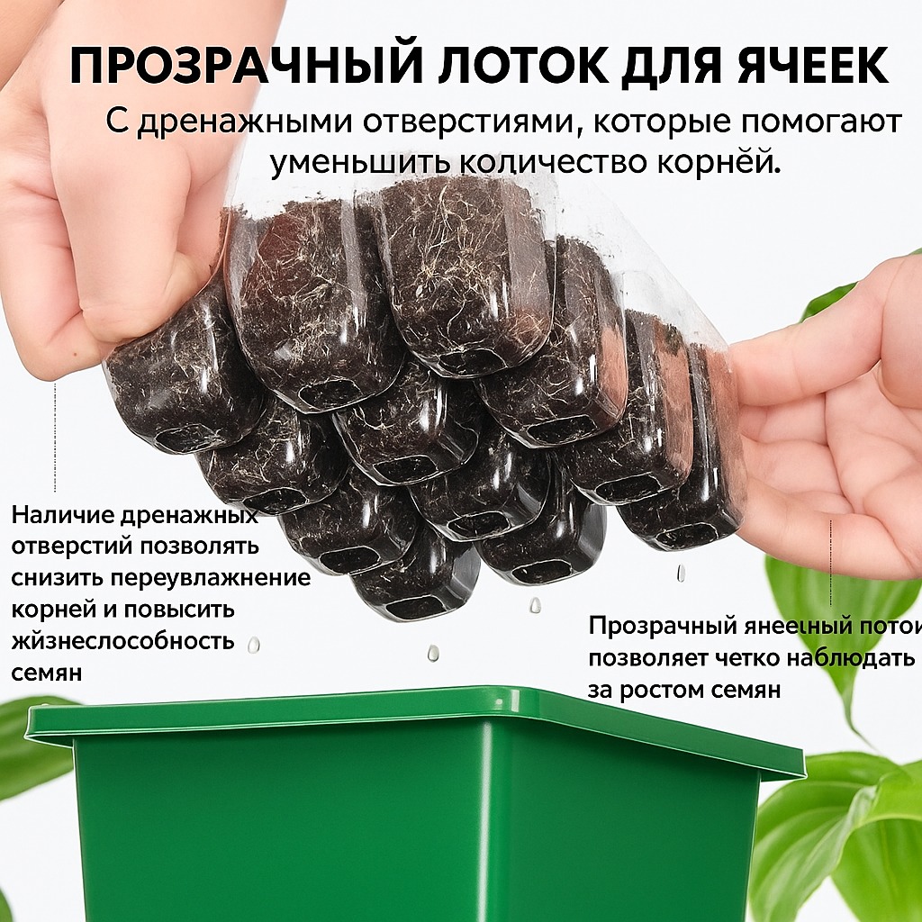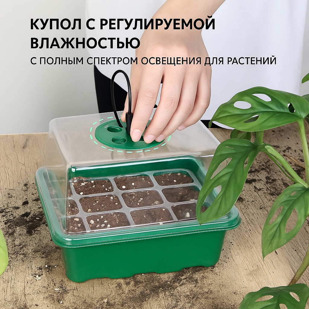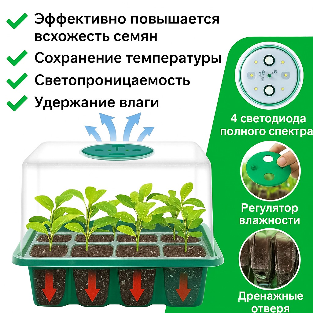 Набор для выращивания рассады изготовлен из прочного и экологичного ABS-пластика. Прозрачный лоток позволяет легко наблюдать за процессом прорастания и развития растений, а регулируемое окно поддерживает оптимальную влажность воздуха (от 50% до 100%) для быстрого и здорового роста.Встроенные светильники полного спектра имитируют естественное солнечное освещение, стимулируют фотосинтез и обеспечивают активное развитие растений на всех стадиях. Дополнительный фиолетовый свет усиливает рост зелени и повышает урожайность.