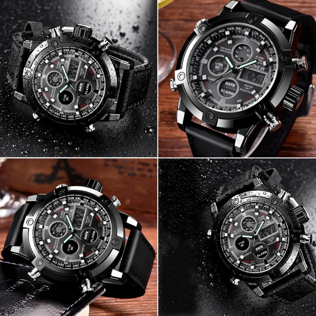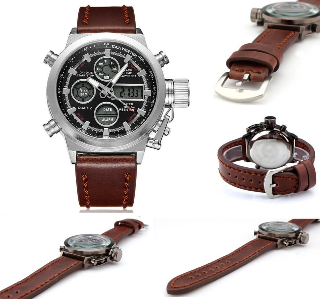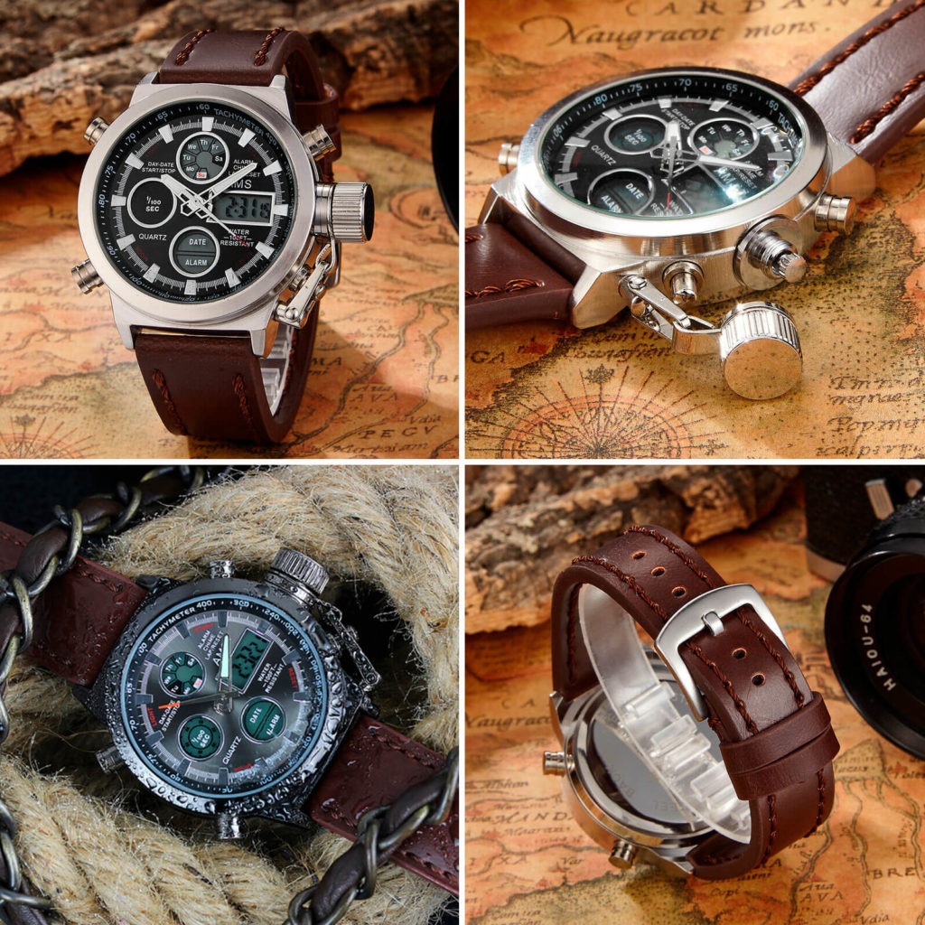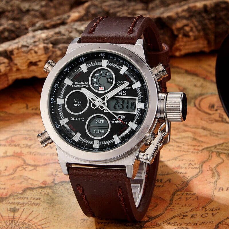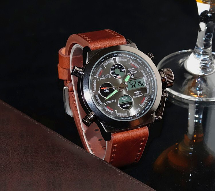 Тип товара Кварцевые наручные часы Стиль Спорт Механизм часов Двойной дисплей Механизм часов QUARTZ Материал корпуса Нержавеющая сталь Длина ремешка 24 Тип застежки Пряжка Глубина водонепроницаемости 5 Бар Особенности Полный календарь, Ударопрочный, Светящиеся стрелки, Секундомер, Светодиодный дисплей, Антимагнитный, Автоматическая настройка времени, День недели, Водонепроницаемый, Дайвер, Подсветка, Хронограф, Множество часовых поясов, Плавание, Будильник, Светящийся Диаметр циферблата 46 Материал коробки и корпуса Без упаковки Тип материала окошка циферблата Хардлекс Форма корпуса Круглый Тип материала браслета Кожа Ширина браслета 22 Вес 130 г