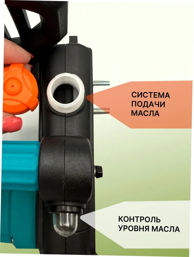 Инструмент оснащён автоматической системой смазки цепи, которая продлевает срок службы шины и цепи, обеспечивая стабильную и плавную работу даже при высоких нагрузках. Шина длиной 16 дюймов (40 см) позволяет легко справляться как с тонкими ветками, так и с толстыми брёвнами.