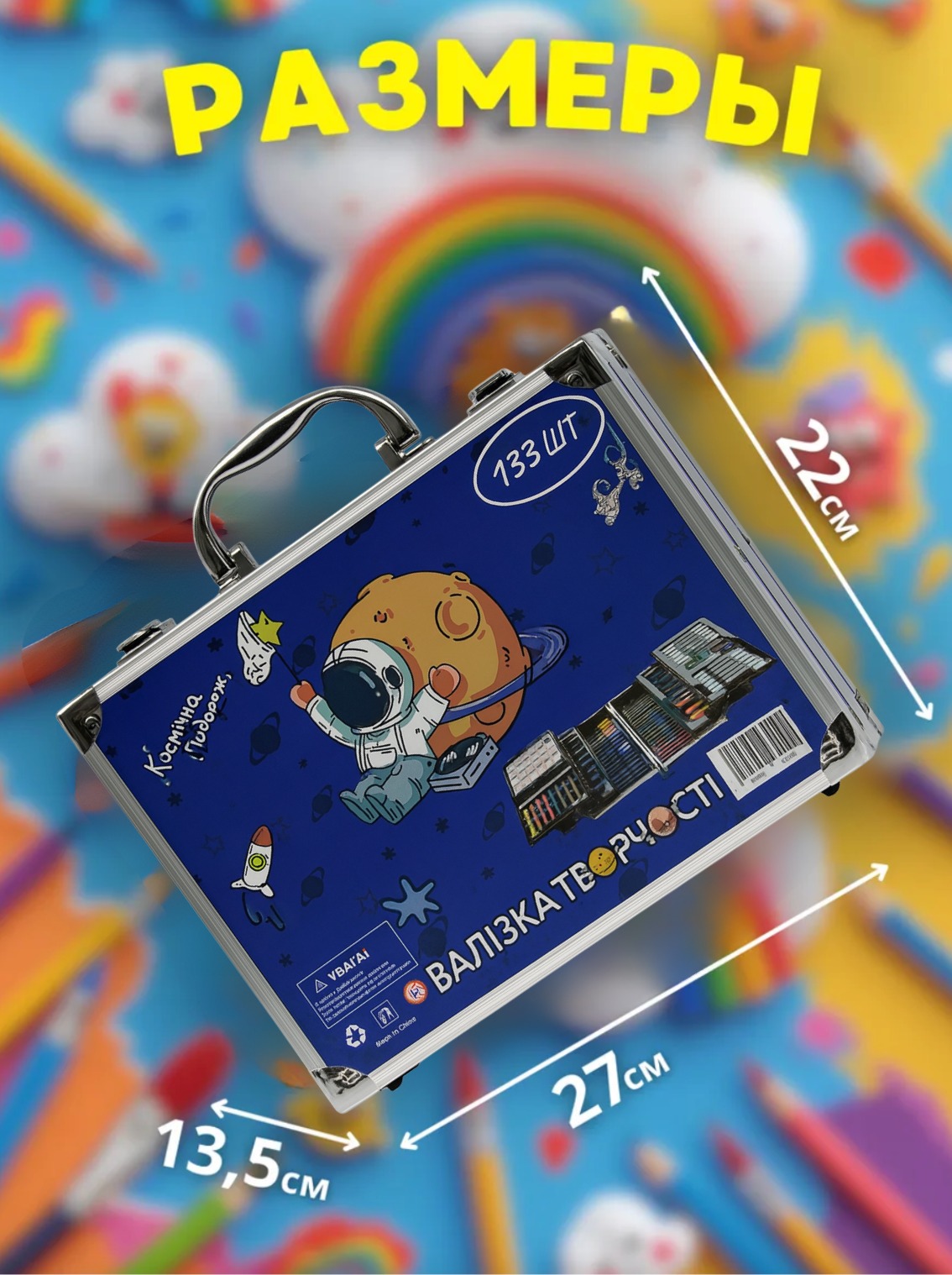 Внутри чемоданчика — 133 предмета для рисования и рукоделия: фломастеры, восковые мелки, мини-маркеры, цветные карандаши, краски, кисточки, точилка, ластик и даже две раскраски.