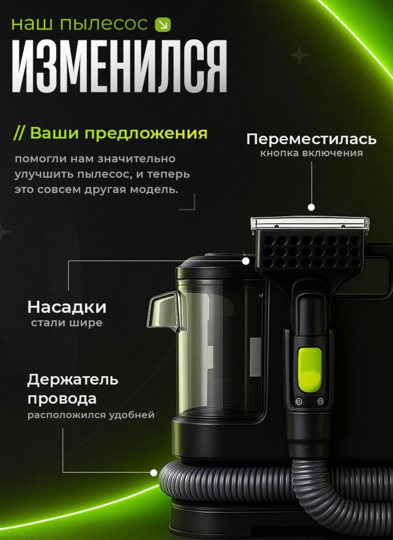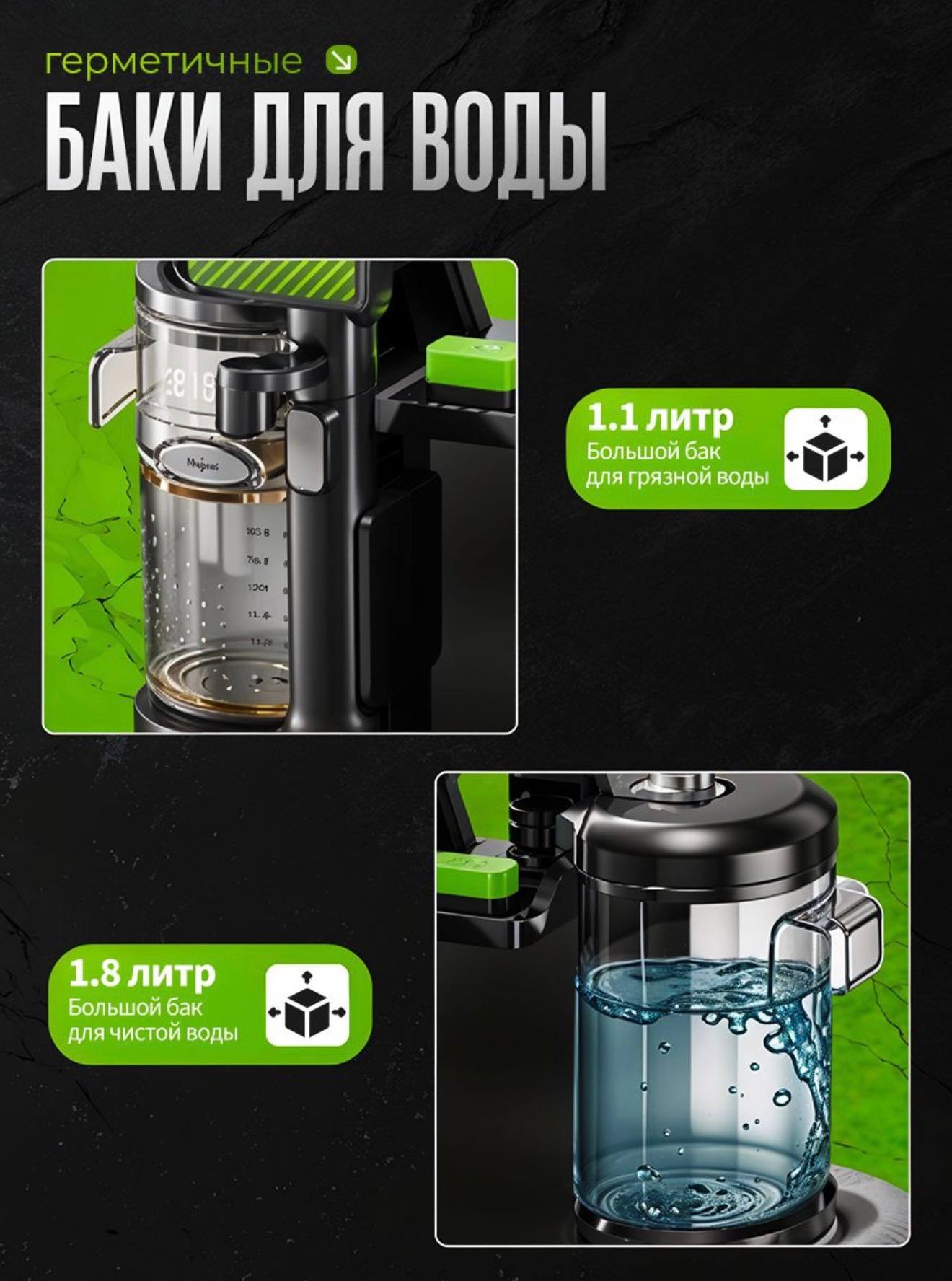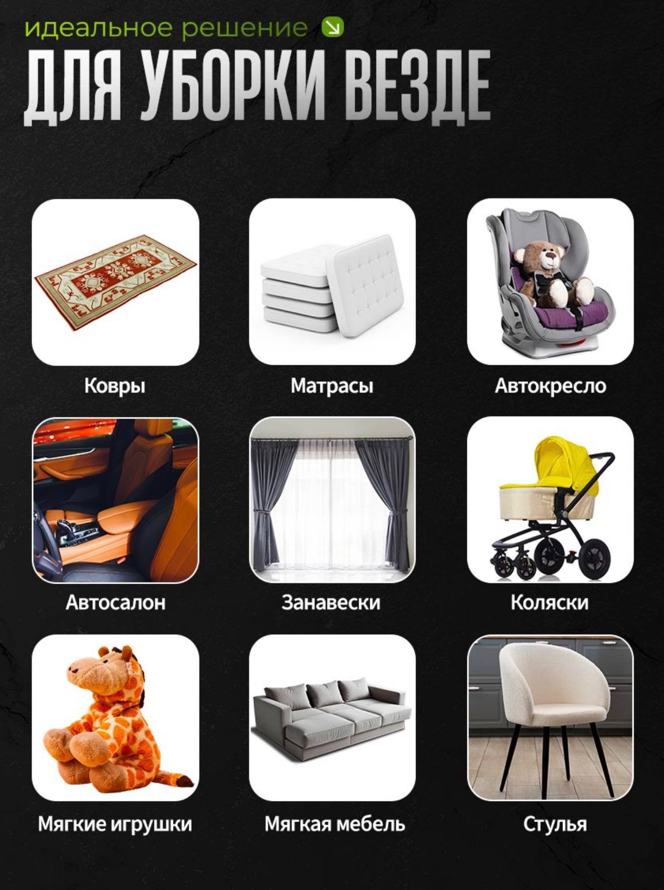 Пылесос идеально подходит как для регулярной уборки, так и для локальной точечной чистки — диванов, кресел, ковровых дорожек, обивки и автомобильного салона. Технология влажной уборки освежает поверхности, возвращая им чистоту и ухоженный внешний вид.