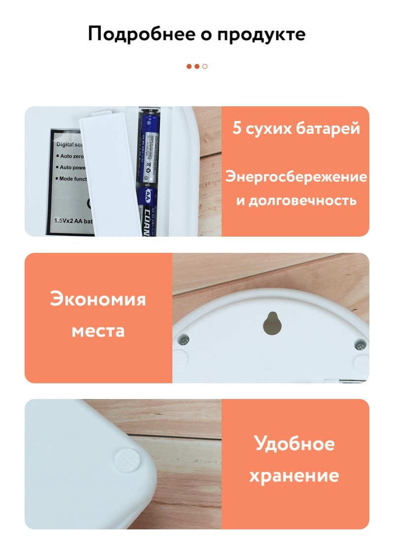 Корпус выполнен из прочного пластика. Платформа круглая, имеет шероховатую поверхность. Возле платформы расположен жидкокристаллический дисплей и кнопки управления весами: вкл/выкл, переключение единиц измерения веса и обнуления тары. Также весы имеют мягкие ножки, которые не царапают поверхность стола. В нижней части весов находится отсек для батареек и отверстие, которое дает возможность повесить весы на стену, когда они не используются. Весы отключаются автоматически, при длительном бездействии. Имеют индикацию перегруза и низкого напряжения.