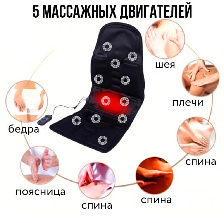 Интенсивность массажа можно менять от расслабляющего (низкая частота вибрации и большая амплитуда) до тонизирующего (высокая частотавибрации и маленькая амплитуда). В массажной накидке предусмотрена функция подогрева,которая, особенно в сочетании с массажем, при болях и отеках спины или дискомфорте во время долгой дороги, позволит быстро улучшить ваше самочувствие.Также подогрев удобно использовать в автомобиле в холодное время года для вашего комфорта.