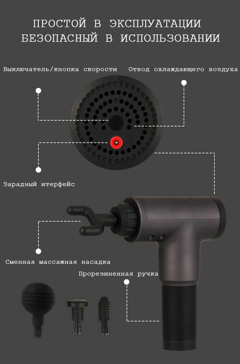Массажер выполнен в эргономичной форме в виде пистолета, он комфортно сидит в руке, им удобно пользоваться. В комплекте имеются 4-е насадки, для воздействия на определенные группы мышц ног, ягодиц, спины, груди, запястья и лодыжек. Оптимальная длительность сеанса - 15 минут, работает от встроенного аккумулятора.Тип массажа: