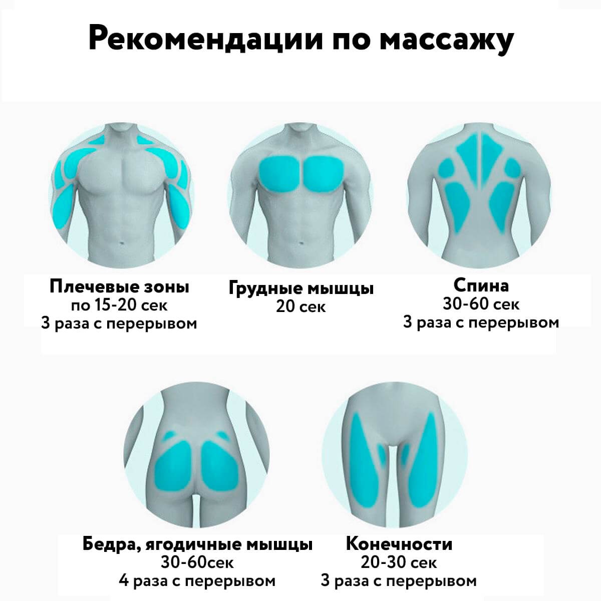 - Плечевые зоны по 15-20 сек. 3 раза с перерывом;
