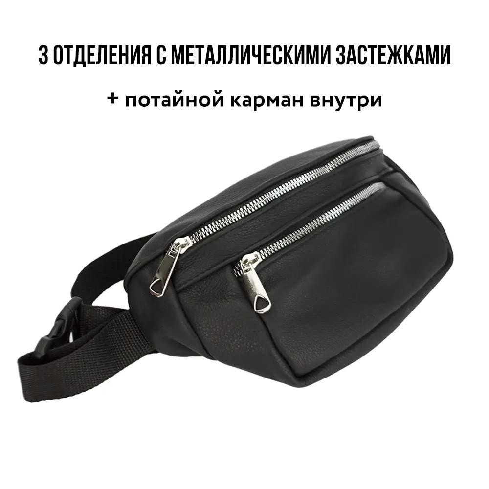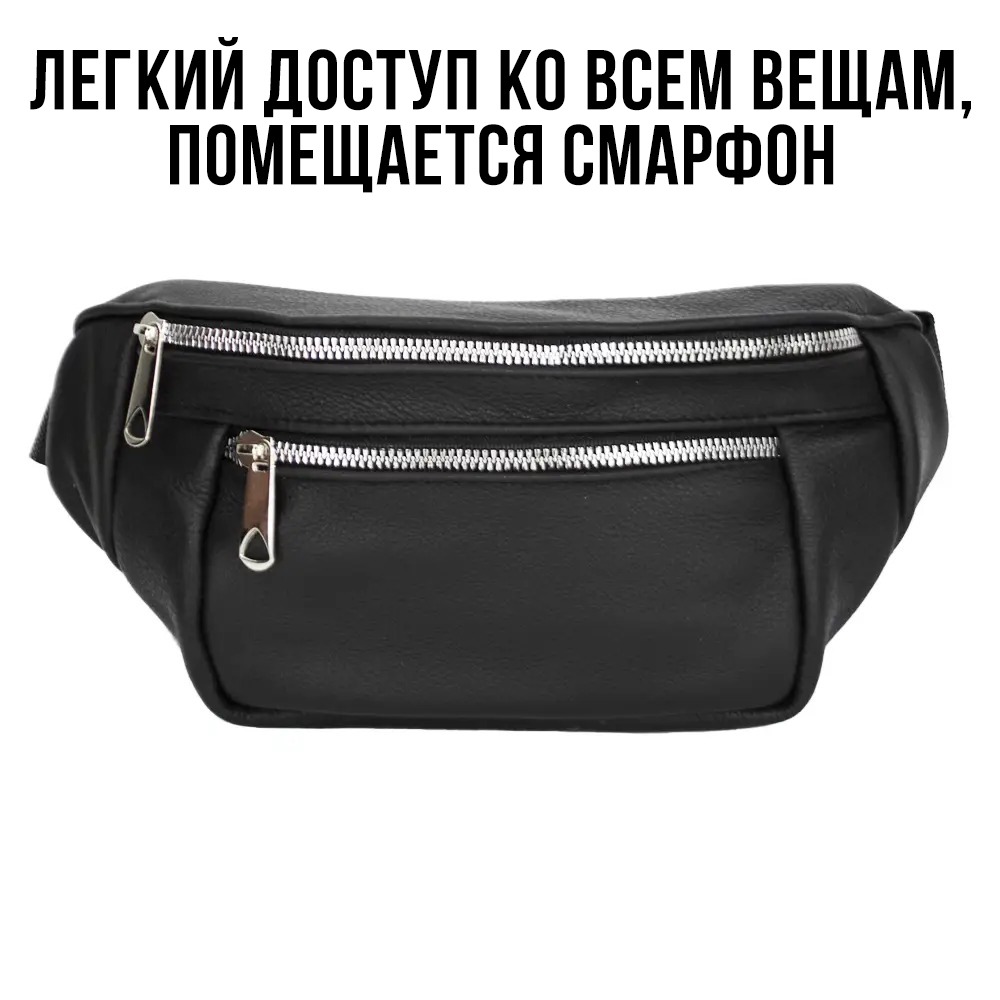 Легкая, качественная сумка-бананка поможет освободить руки во время прогулки или повседневных дел. Изготовлена из гладкой кожи черного цвета, подклад тканевый. Бананка имеет основное отделение, один карман на молнии на задней стороне сумки, в котором можно разместить телефон, а также один небольшой карман на лицевой стороне сумки. В основном отделении можно разметить кошелек, ключи или другие небольшие вещи.