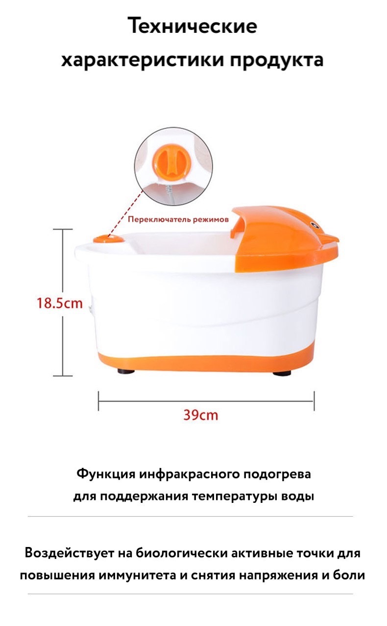Массажер для ног очень удобный и простой в использовании. Прорезиненные ножки придают ему устойчивость на поверхности. Температуру воды можно поддерживать при помощи специальной функции инфракрасного подогрева.