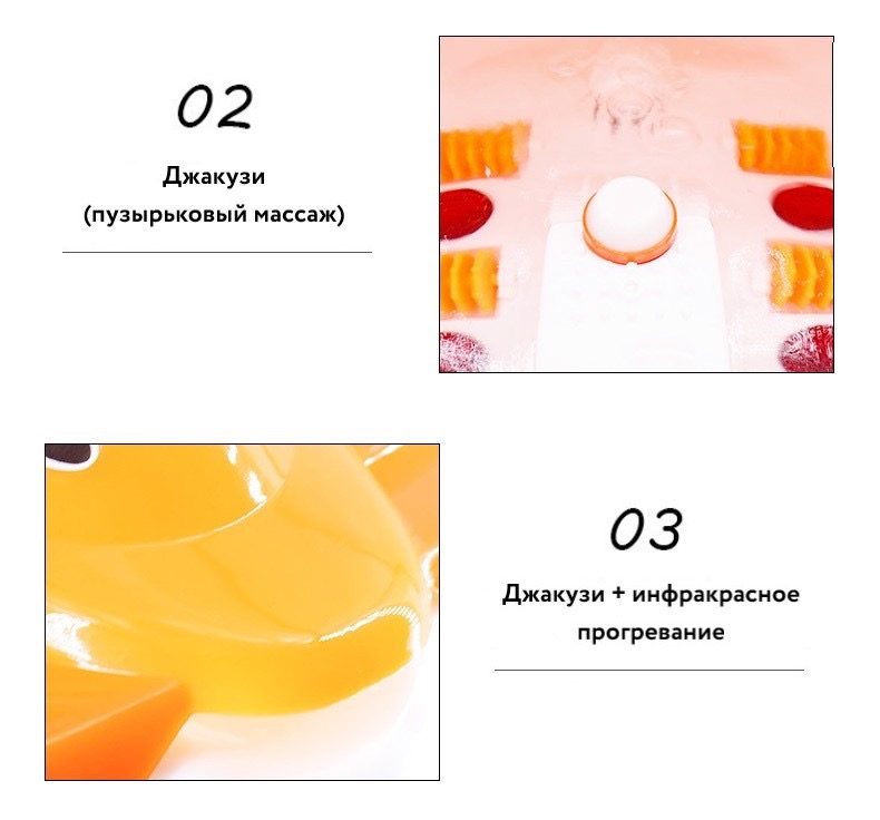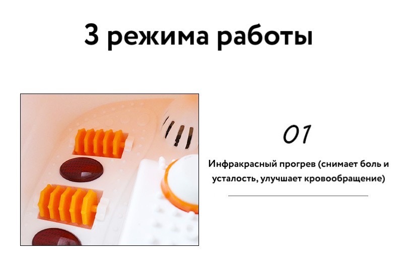 Имеет несколько режимов массажа (вибрационный, "джакузи", механический) и насадки для педикюра (щетка и шлифующая насадка — пемза).