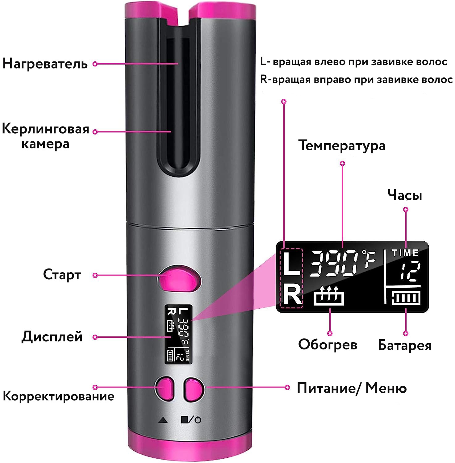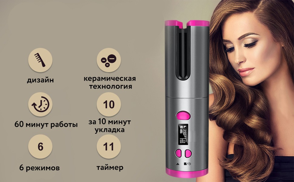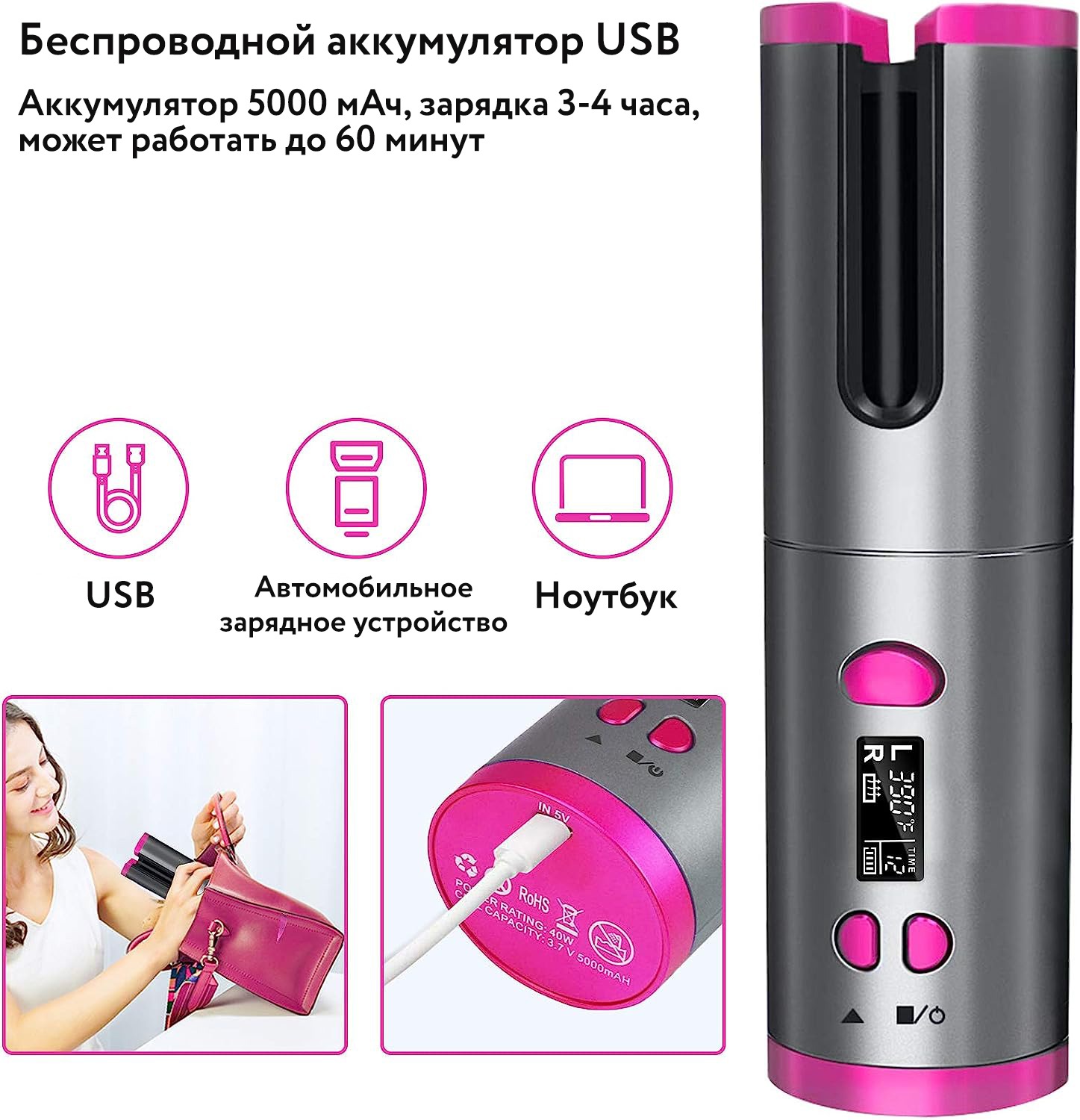 Беспроводной керамический стайлер для завивки волос с дисплеем. Плойка автобигуди