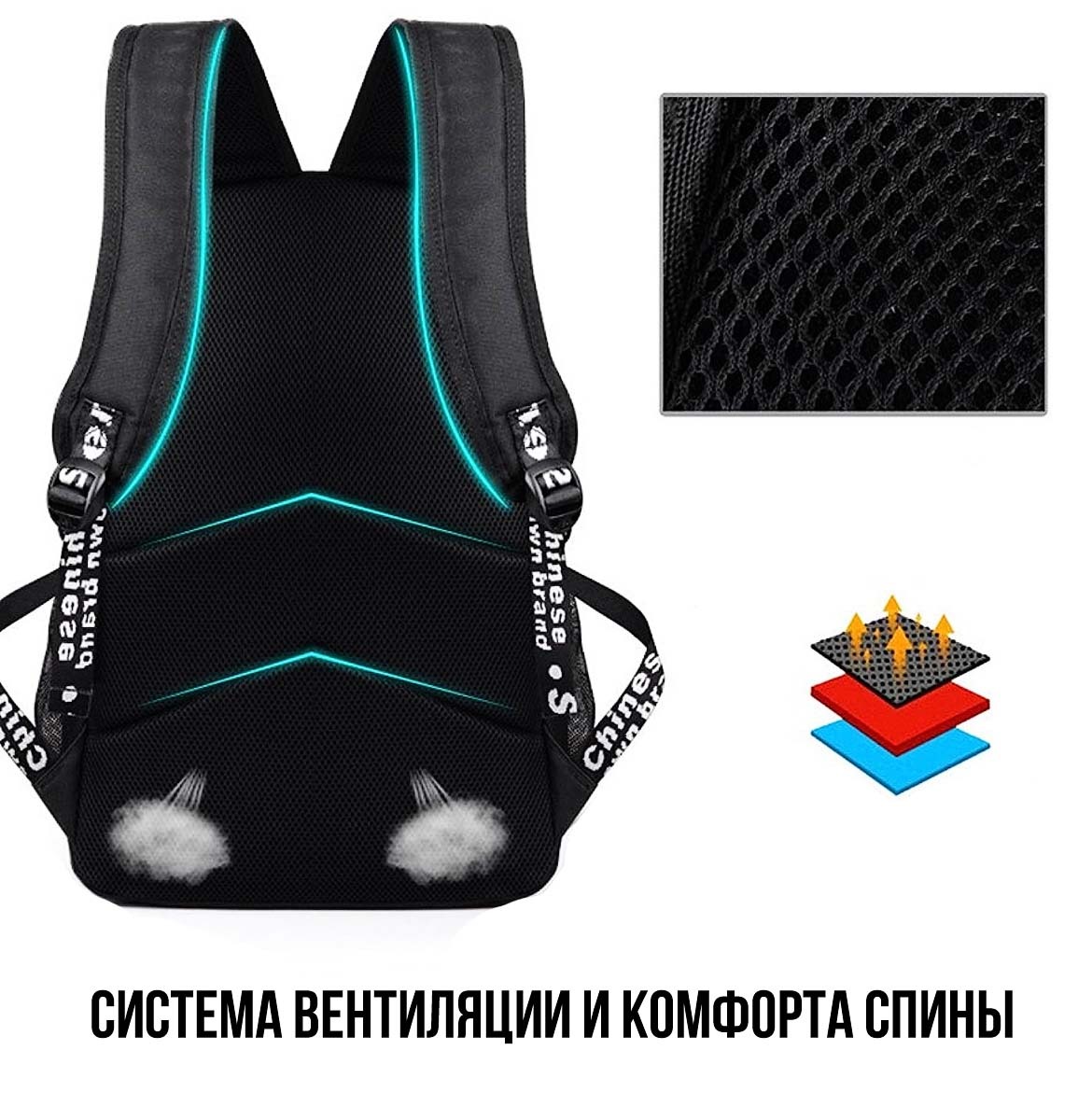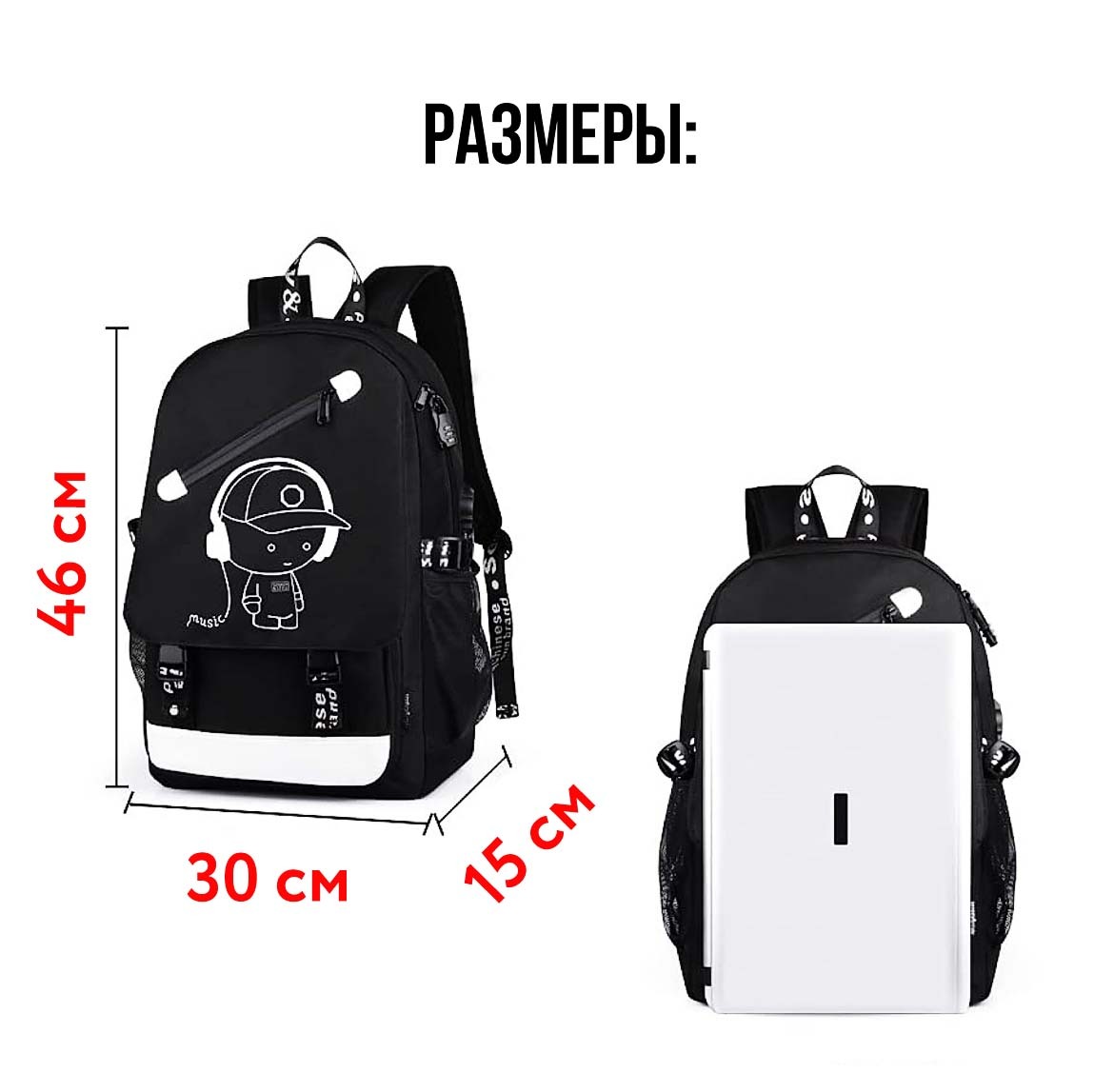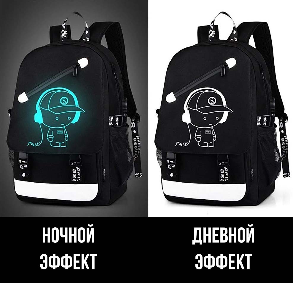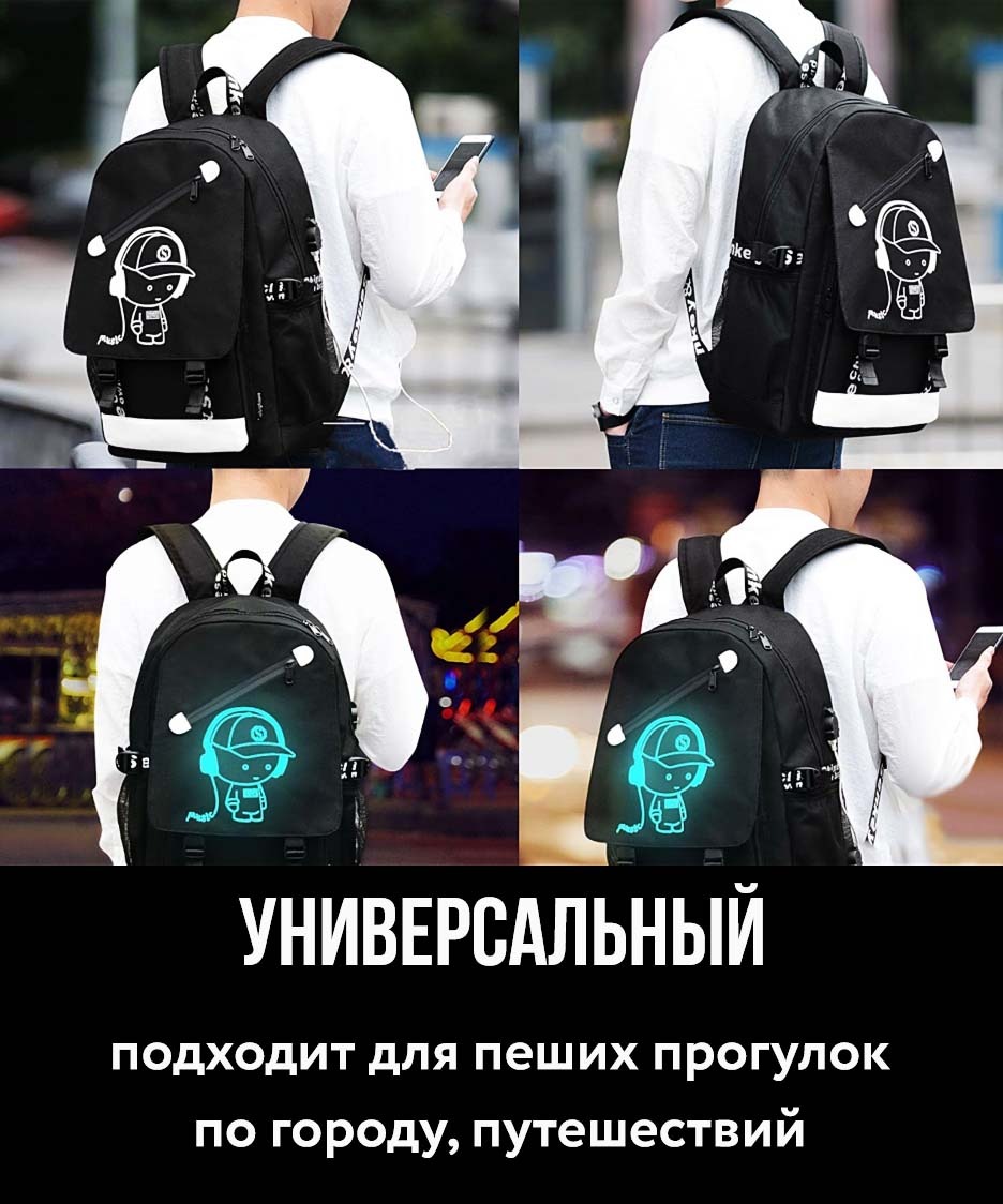 Рюкзак изготовлен из прочной и водоотталкивающей спортивной плащевки, которая легко чистится, практична в использовании и хорошо выглядит. Изделие имеет два отделения на молнии. В основном отделение есть отделение для ноутбука на липучке. Внешне есть две боковые кармашки и один карман спереди на замке.Особенностью данного рюкзака является наличие внутри USB порта для зарядки вашего смартфона на ходу, а источник зарядки PowerBank держать можна при этом внутри рюкзака. В рюкзак помещается ноутбук размером 15,6 дюймов. В комплект к рюкзаку входит с кодовым замком. Для того чтобы рюкзак светился в темноте, нужно его подержать на ярком свете совсем недолго (5-10 минут) и он несколько часов (2-4) будет светиться в темноте. В дневное время этот рюкзак черного цвета с белым рисунком, но выключите свет - он начнет выделять флуоресцентный свет.