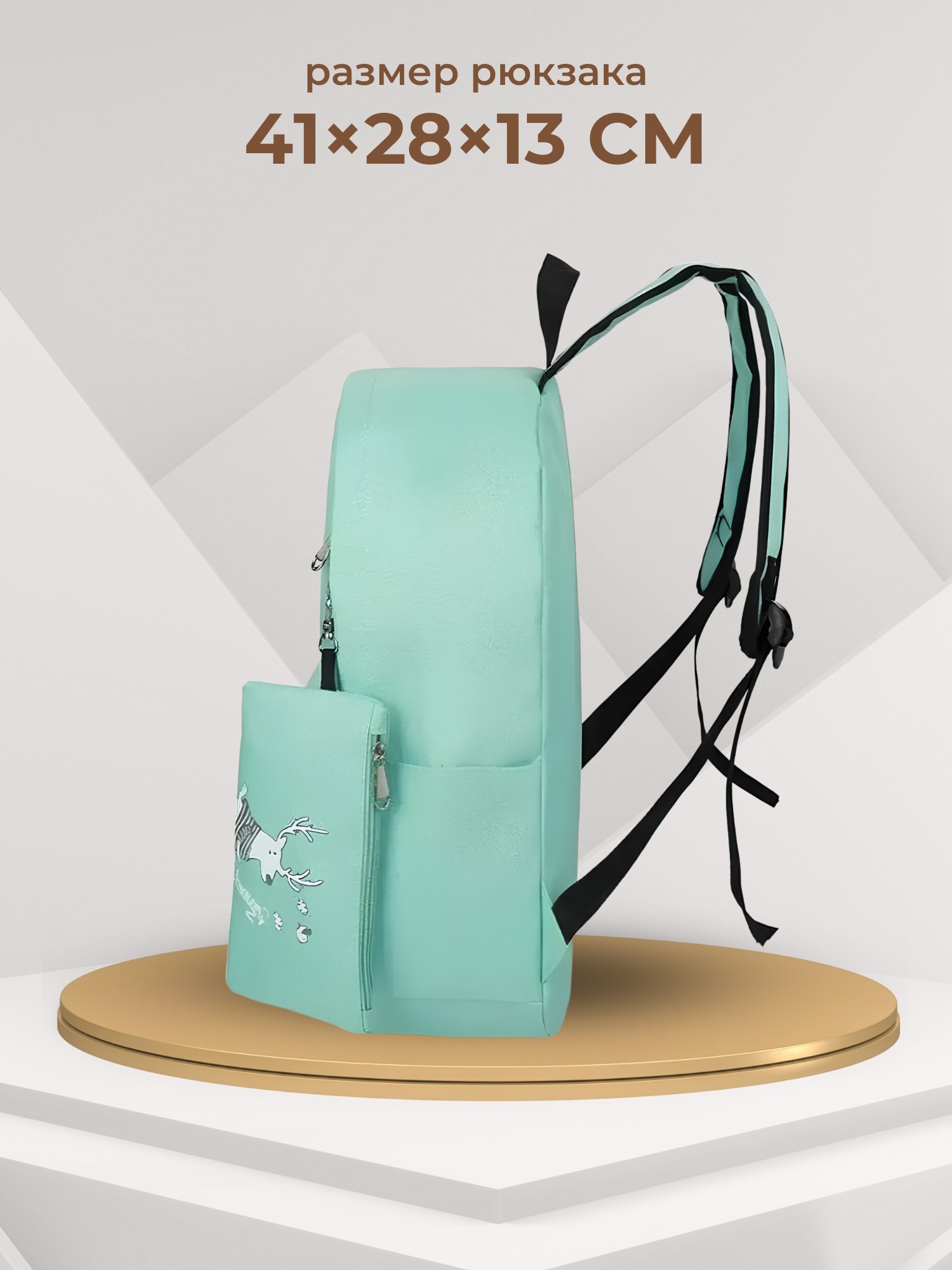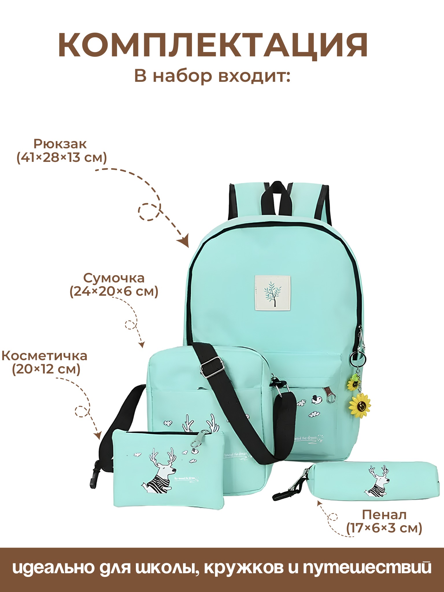- Размеры: рюкзака 41*28*13 см;сумочки 24*20*6 см;косметичка 20*12 см;пенал 17*6*3 см;