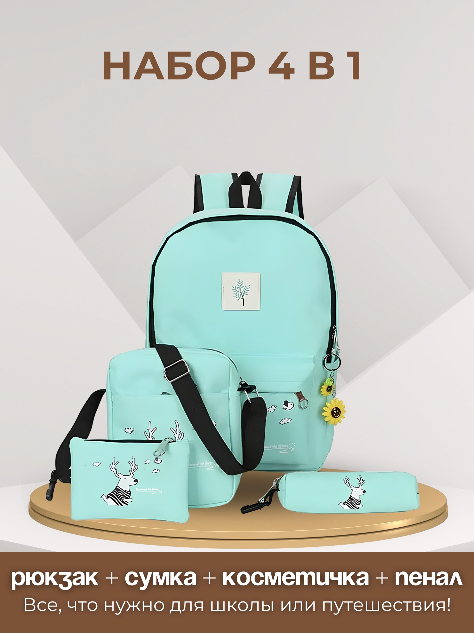 Набор сумок 4в1. Рюкзак, сумка, косметичка, пенал бирюзовый