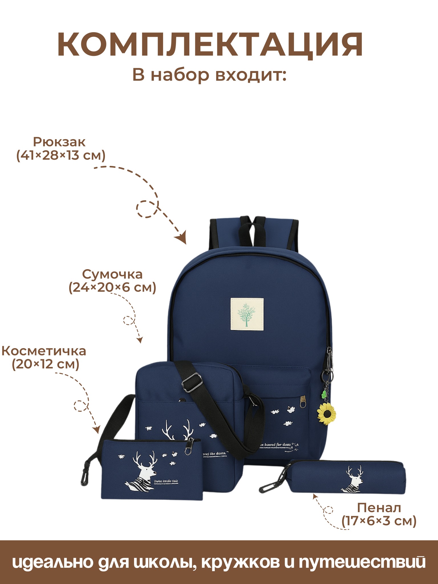 - Размеры: рюкзака 41*28*13 см;сумочки 24*20*6 см;косметичка 20*12 см;пенал 17*6*3 см;