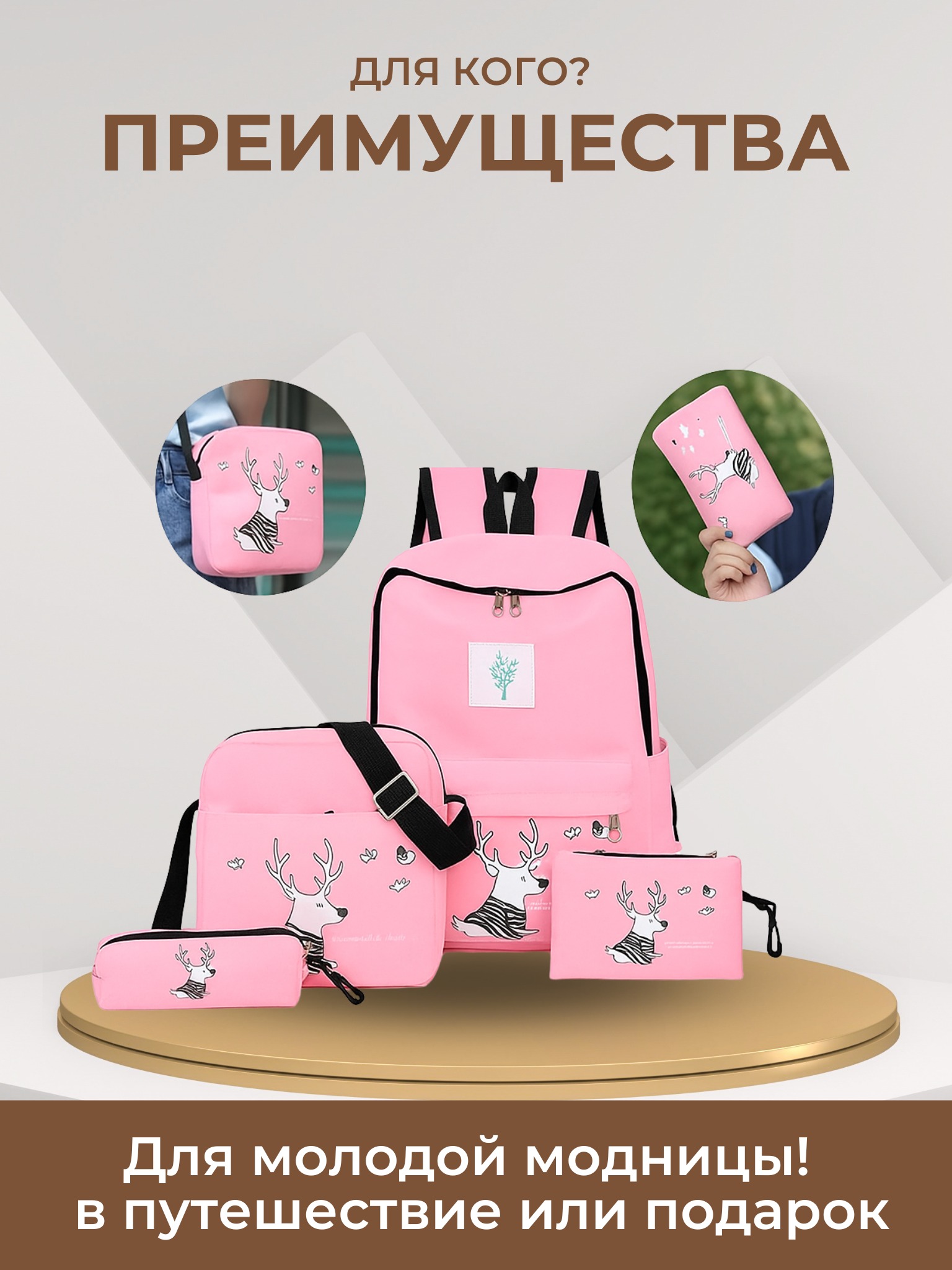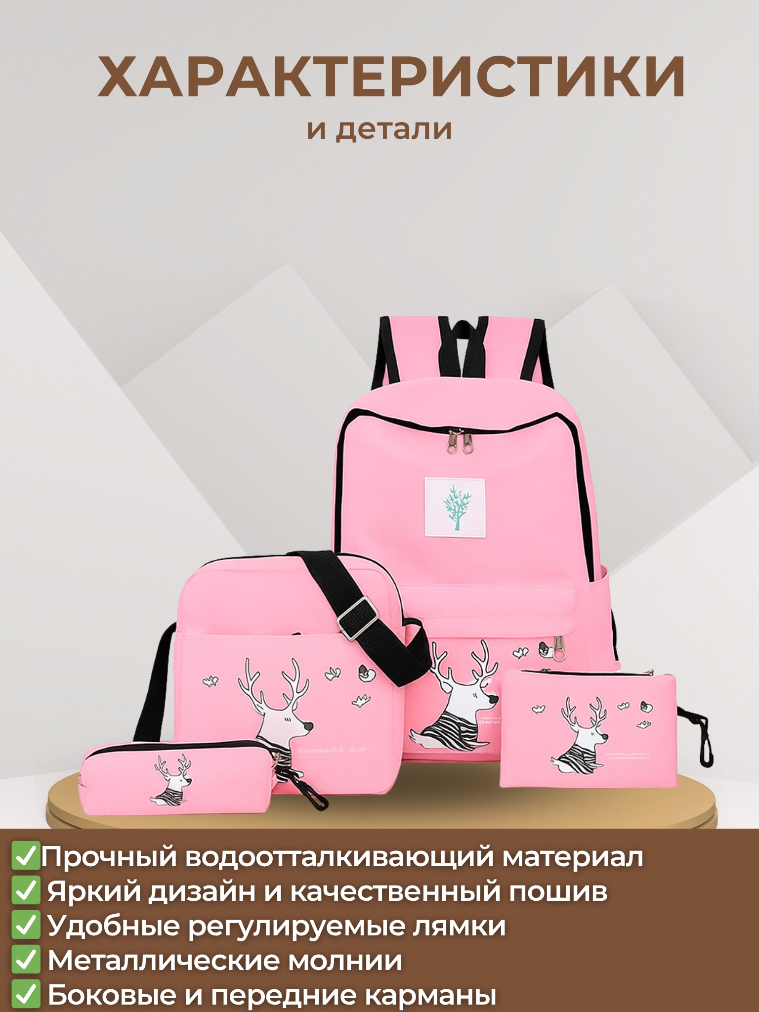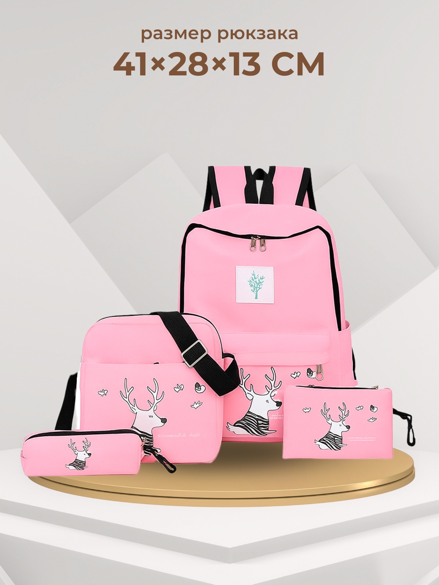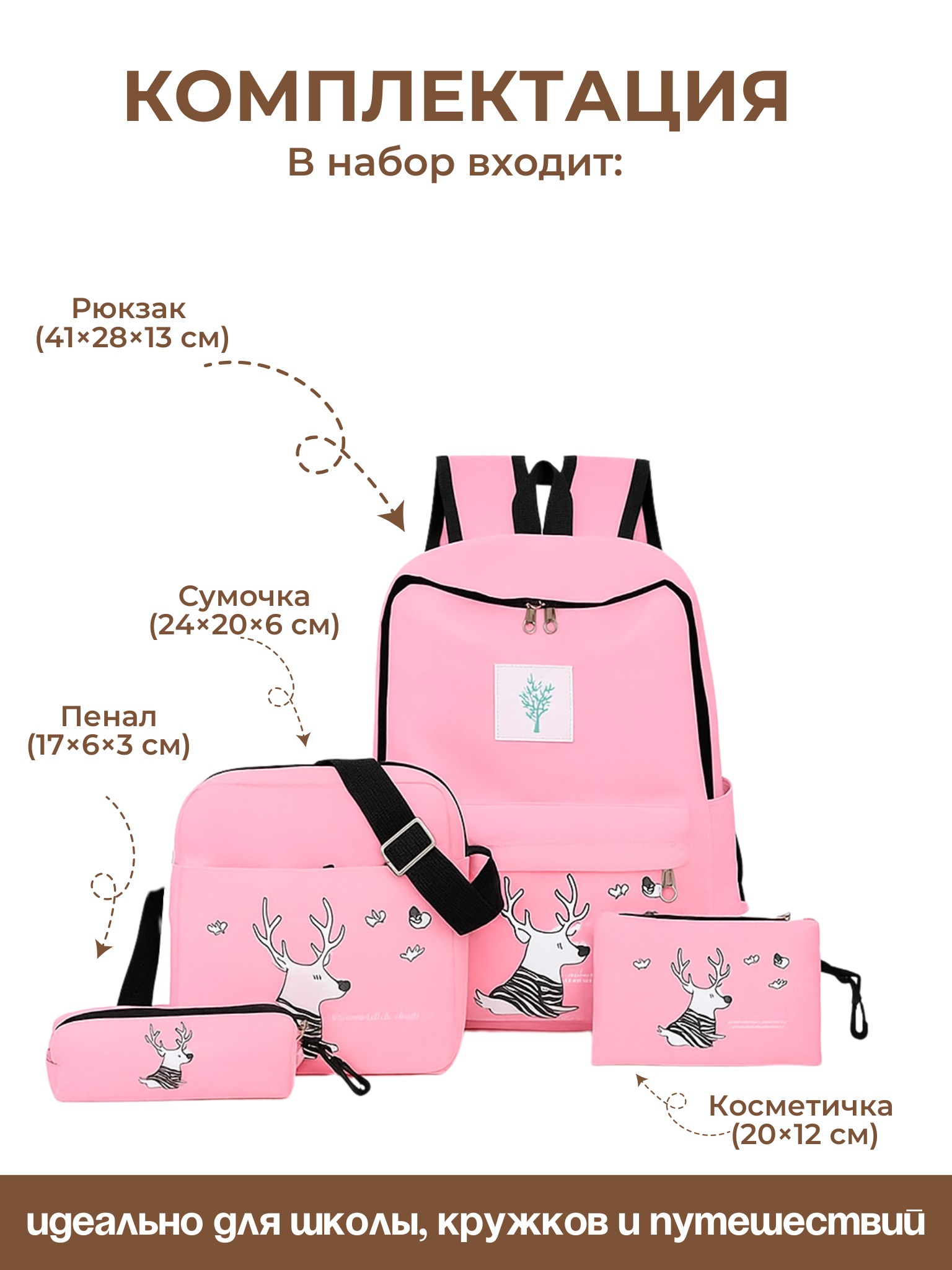 - Размеры: рюкзака 41*28*13 см;сумочки 24*20*6 см;косметичка 20*12 см;пенал 17*6*3 см;