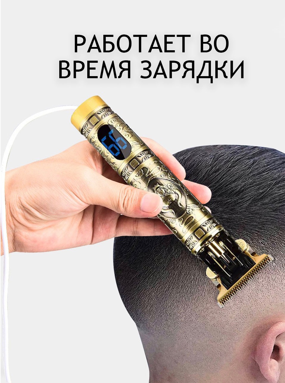 Отличается прочным алюминиевым корпусом, устойчивым к вибрации, низким уровнем шума, стильным винтажным дизайном с гравировками, плавным ходом острых лезвий и длительным сроком службы. Во время работы устройство не создает значительного шума. Сменные насадки позволяют выбрать длину стрижки от 1 до 3 мм (3 насадки: 1, 2, 3 мм).