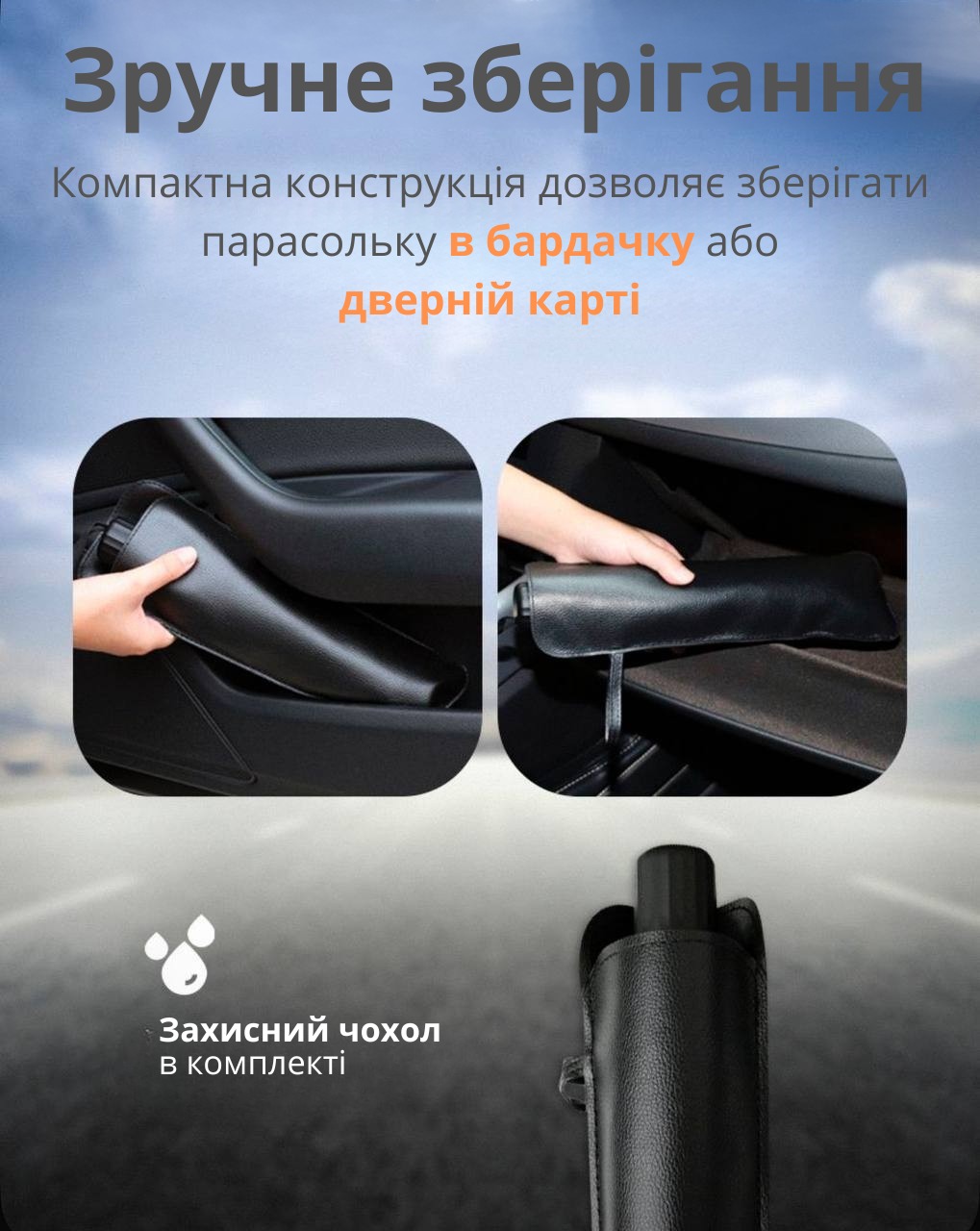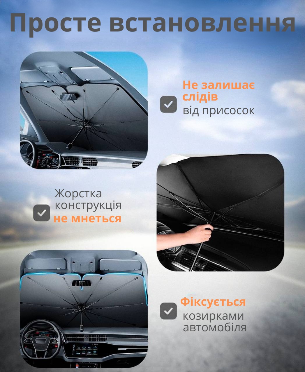 Зустрічайте інноваційну сонцезахисну парасольку, яка за лічені секунди перетворить ваш автомобіль на прохолодний оазис. Пристрій легко складається за принципом звичайної парасолі та надійно захищає від палючого сонця. Завдяки розмірам — ширина 145 см, висота 79 см — він підходить для більшості легкових авто.Виготовлений із міцних і якісних матеріалів, цей аксесуар ефективно відбиває сонячні промені, запобігає перегріву салону та вигоранню елементів інтер’єру. Компактний і зручний, він легко поміщається в бардачку або багажнику.
