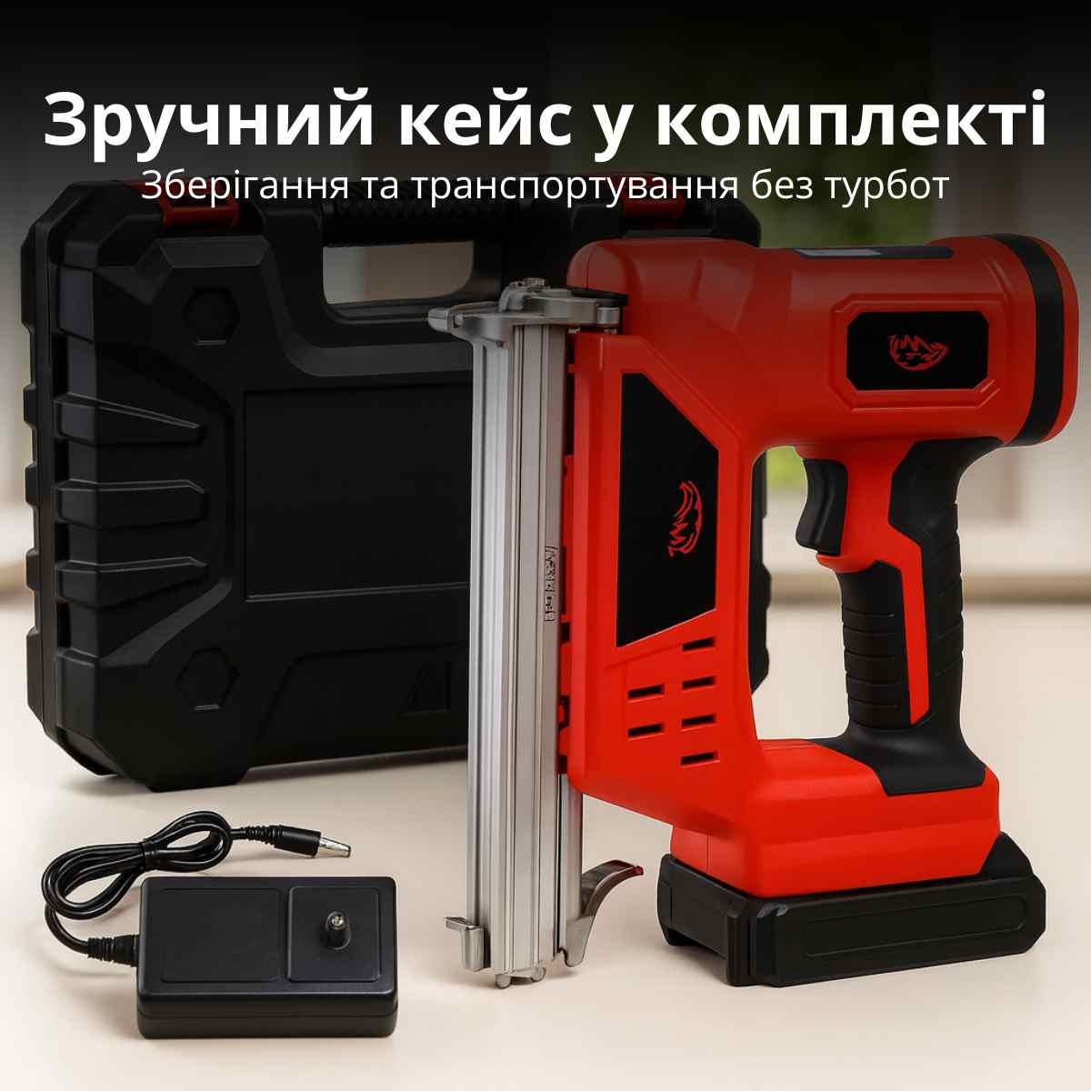 Ергономічний дизайн та невелика вага роблять інструмент зручним навіть для роботи у важкодоступних місцях. У комплекті є практичний кейс, що захистить пристрій від пошкоджень і полегшить його транспортування. Завдяки сумісності з цвяхами довжиною до 30 мм, степлер підходить як для оббивки меблів, так і для будівництва дерев’яних конструкцій.
