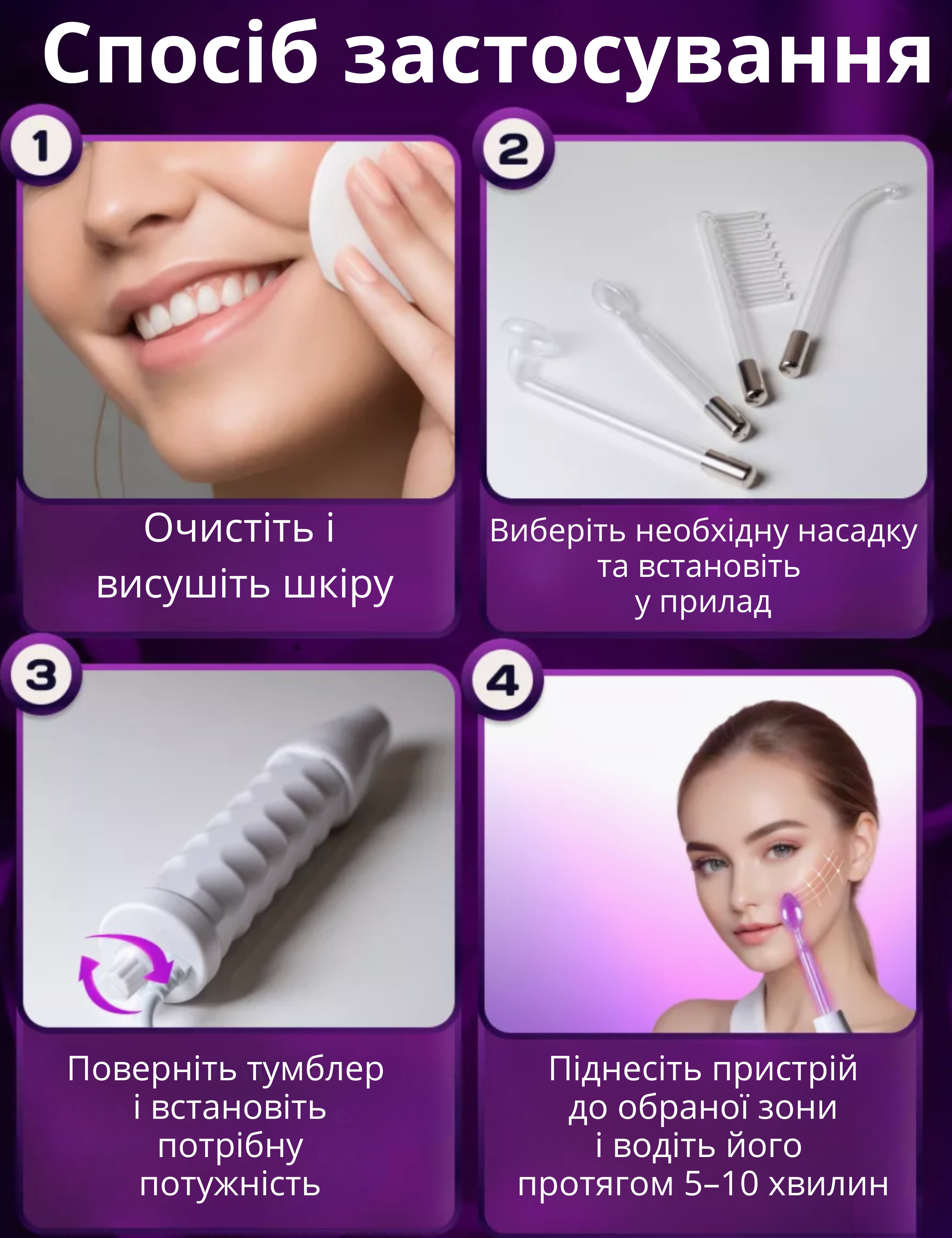 Дарсонваль простий і зручний у використанні: оберіть потрібну насадку, встановіть комфортний рівень інтенсивності й насолоджуйтеся процедурою прямо вдома.