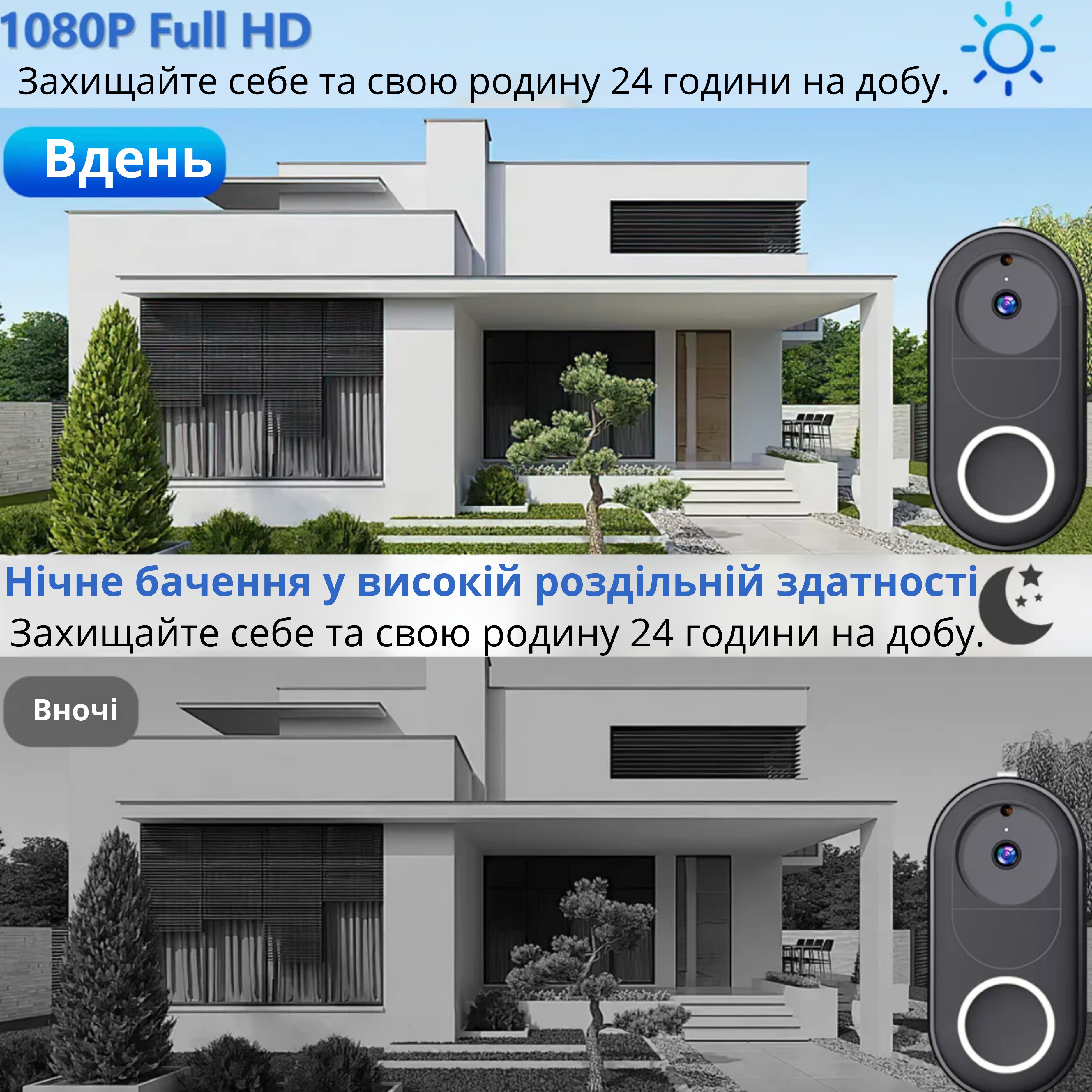 Бездротовий домофон з камерою забезпечує надійний захист і зручність. Пристрій оснащений Full HD-камерою з широким кутом огляду, датчиком руху, двостороннім аудіозв’язком та нічним баченням. Легка установка та тривалий час автономної роботи роблять його ідеальним вибором для дому чи квартири.