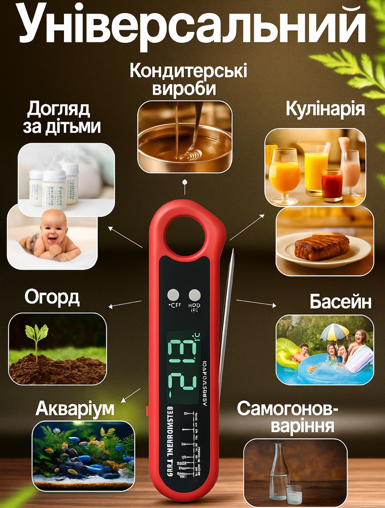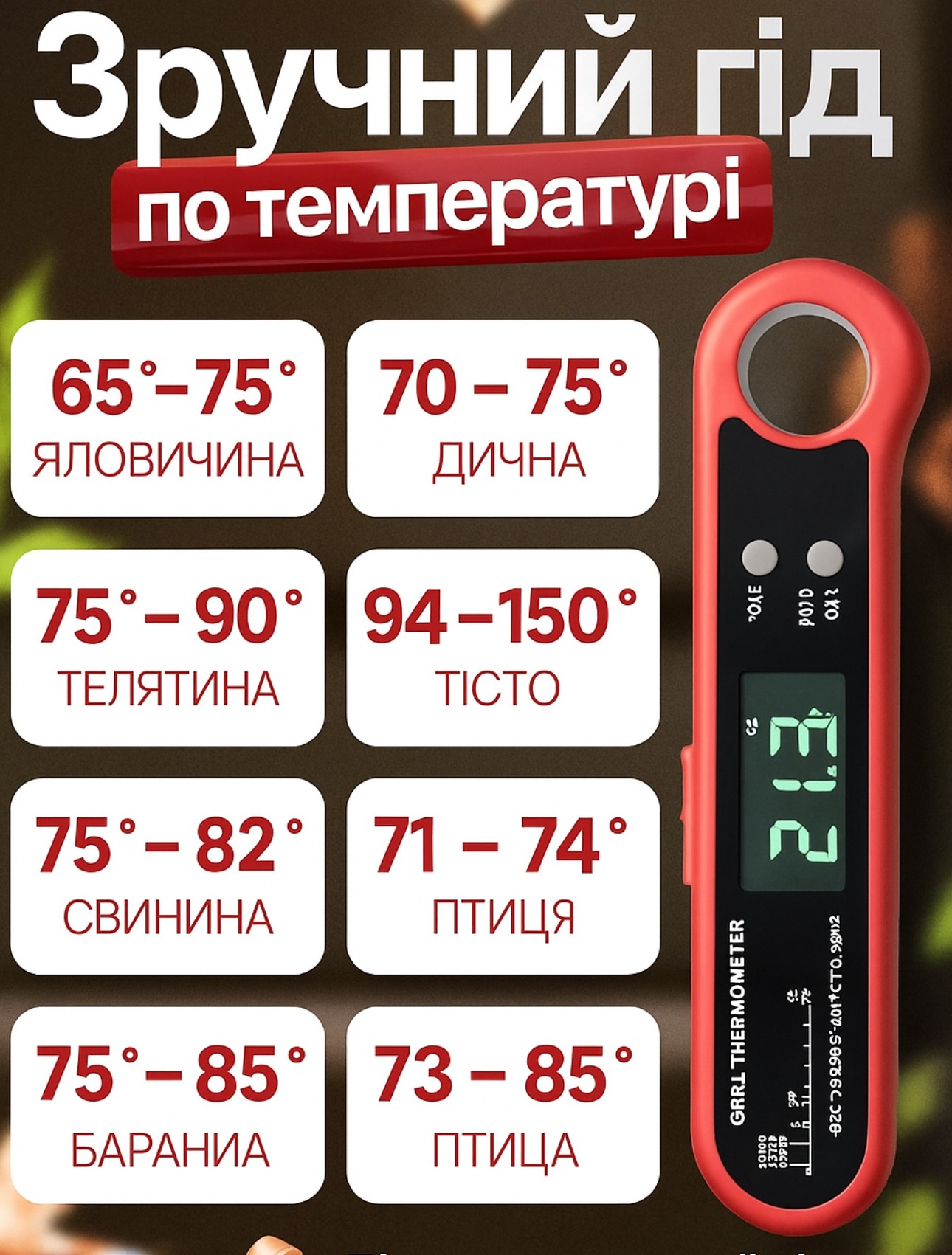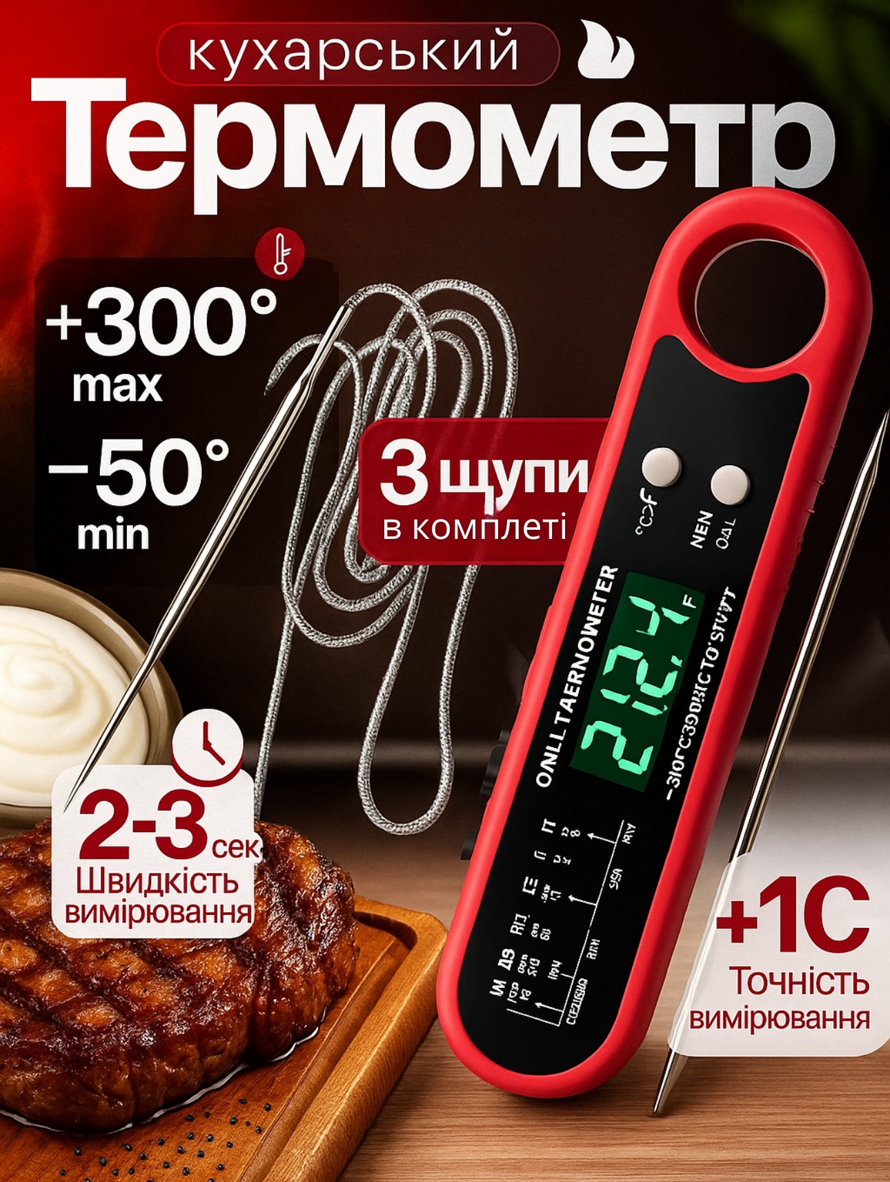 Digital Thermometer — складаний прилад для вимірювання температури продуктів і рідин у діапазоні від -50 градусів до +300 градусів . Завдяки високій точності та швидкому відгуку він стане незамінним інструментом під час приготування різноманітних страв — від стейків і бургерів до курки, риби, випічки та десертів.