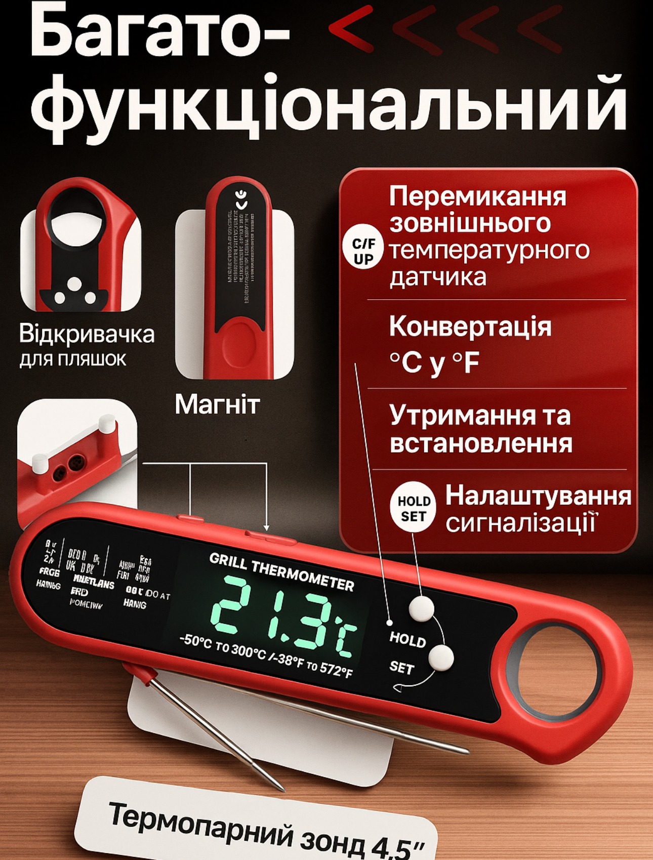 Розширений діапазон вимірювань — підходить для гриля, духовки, кондитерських виробів та напоїв.