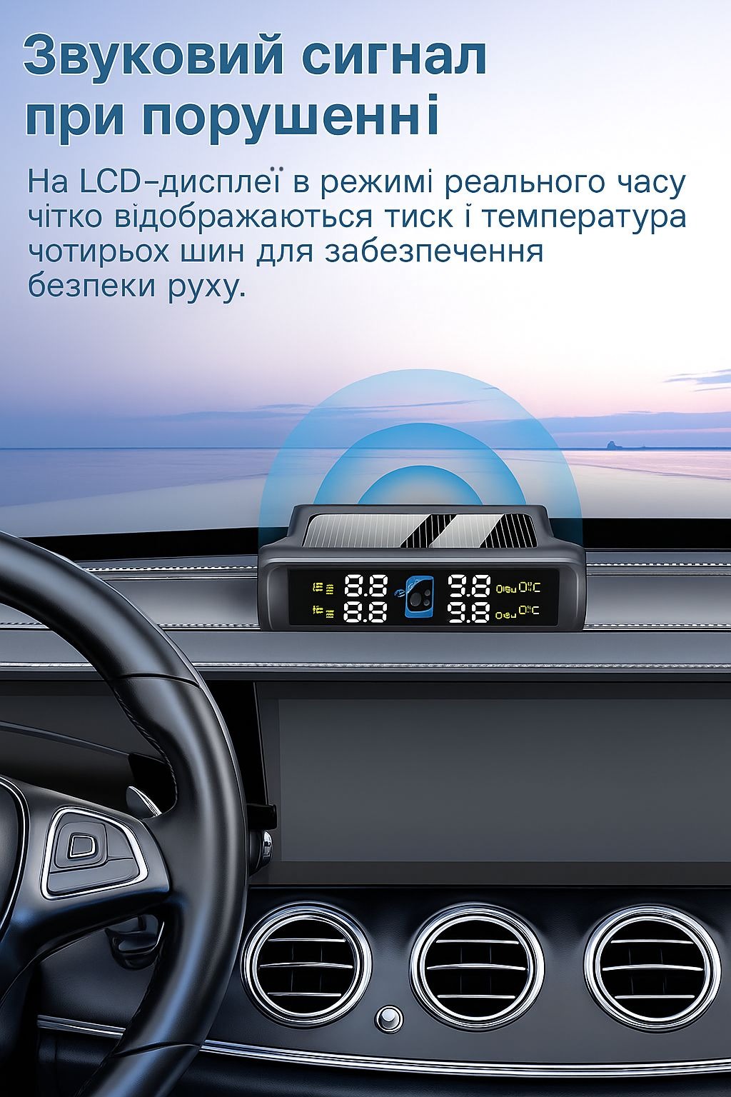 Система забезпечує постійний моніторинг стану шин автомобіля, підвищує безпеку руху та продовжує термін служби покришок. Оснащена сонячною панеллю для зарядки, не потребує підключення до бортової мережі, зручна у використанні та проста в установці.