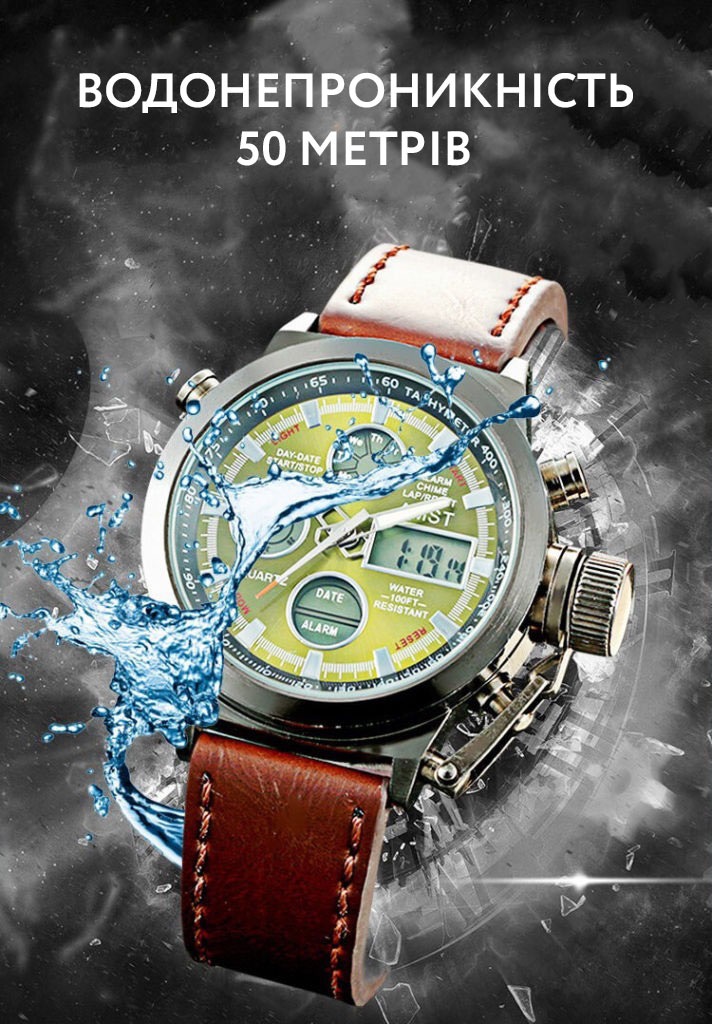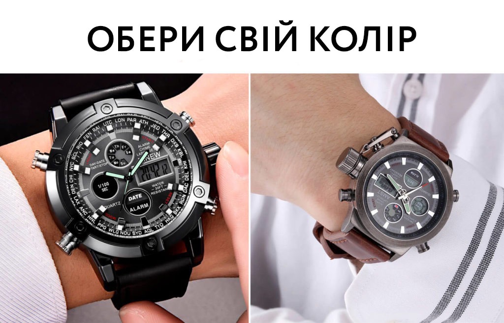 Тип товару Кварцовий наручний годинник Стиль Спорт Механізм годинника Подвійний дисплей Механізм годинника QUARTZ Матеріал корпусу Нержавіюча сталь Довжина ремінця 24 Тип застібки Пряжка Глибина водонепроникності 5 Бар Особливості Повний календар, Ударостійкий, Світиться стрілка, Секундомір, Світлодіодний дисплей, Антимагнітний, Автоматичне налаштування часу, День тижня, Водонепроникний, Дайвер, Підсвічування, Хронограф, Безліч часових поясів, Плавання, Будильник, Світиться Діаметр циферблату 46 Матеріал коробки та корпусу Без упаковки Тип матеріалу віконця циферблату Хардлекс Форма корпусу Круглий Тип матеріалу браслета Шкіра Ширина браслета 22 Вага 130 г