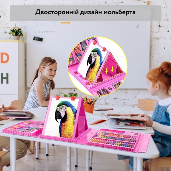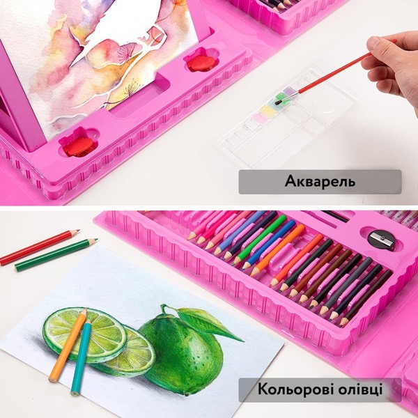 Дитячий набір для малювання з мольбертом 208 предметів рожевий українською мовою