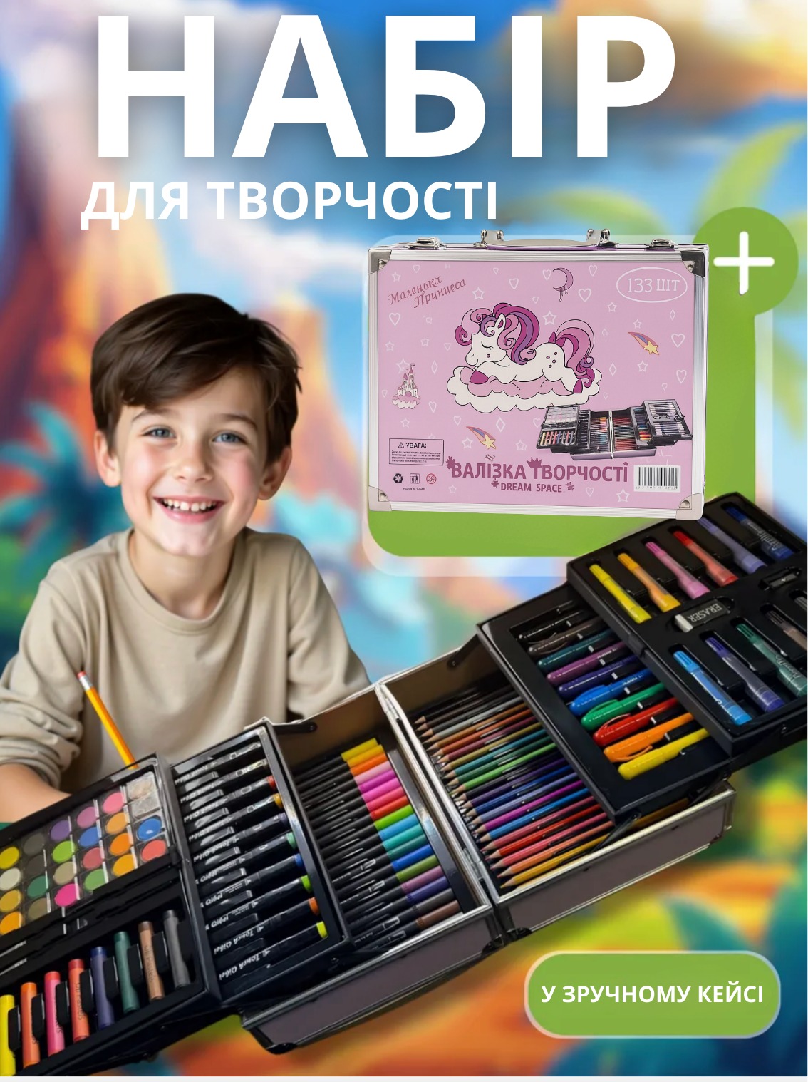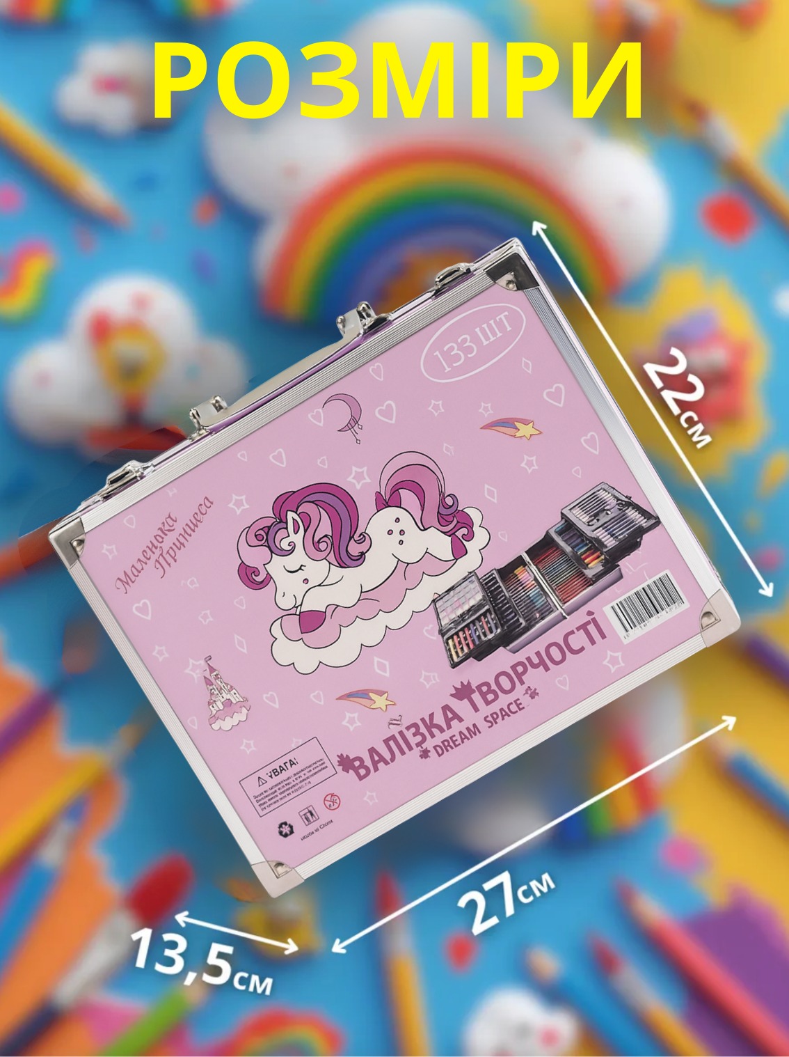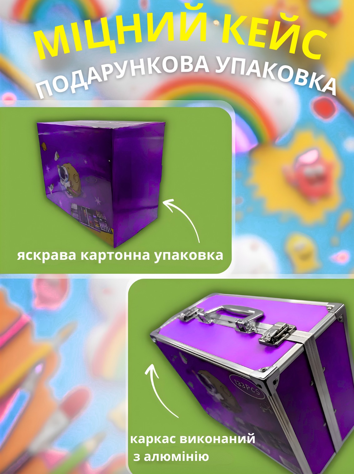 Усередині зручної дерев’яної валізки зібрано 133 предмети, серед яких фломастери, воскові крейди, кольорові олівці, фарби, пензлики, точилка, ластик і дві розмальовки.