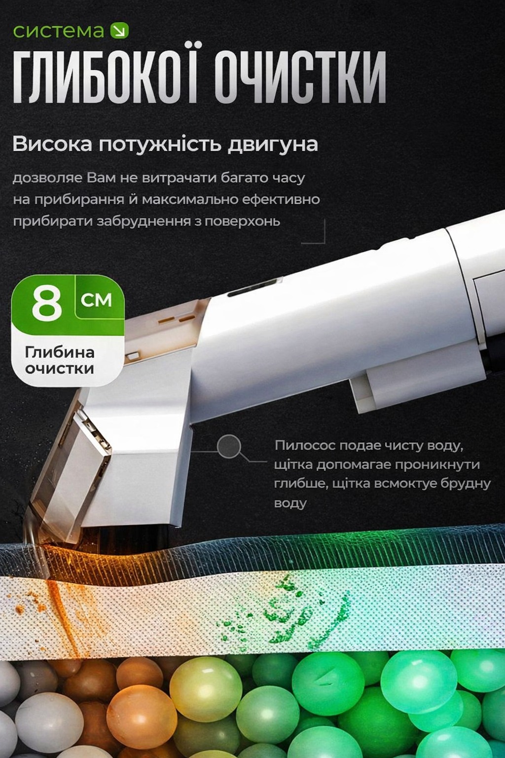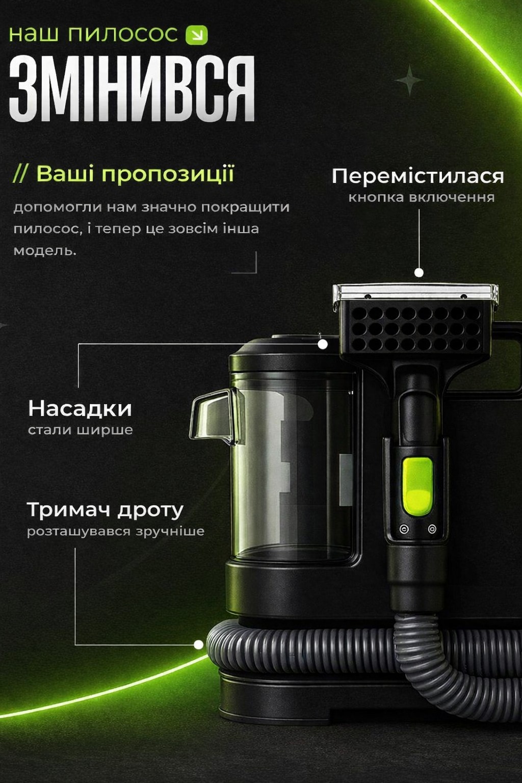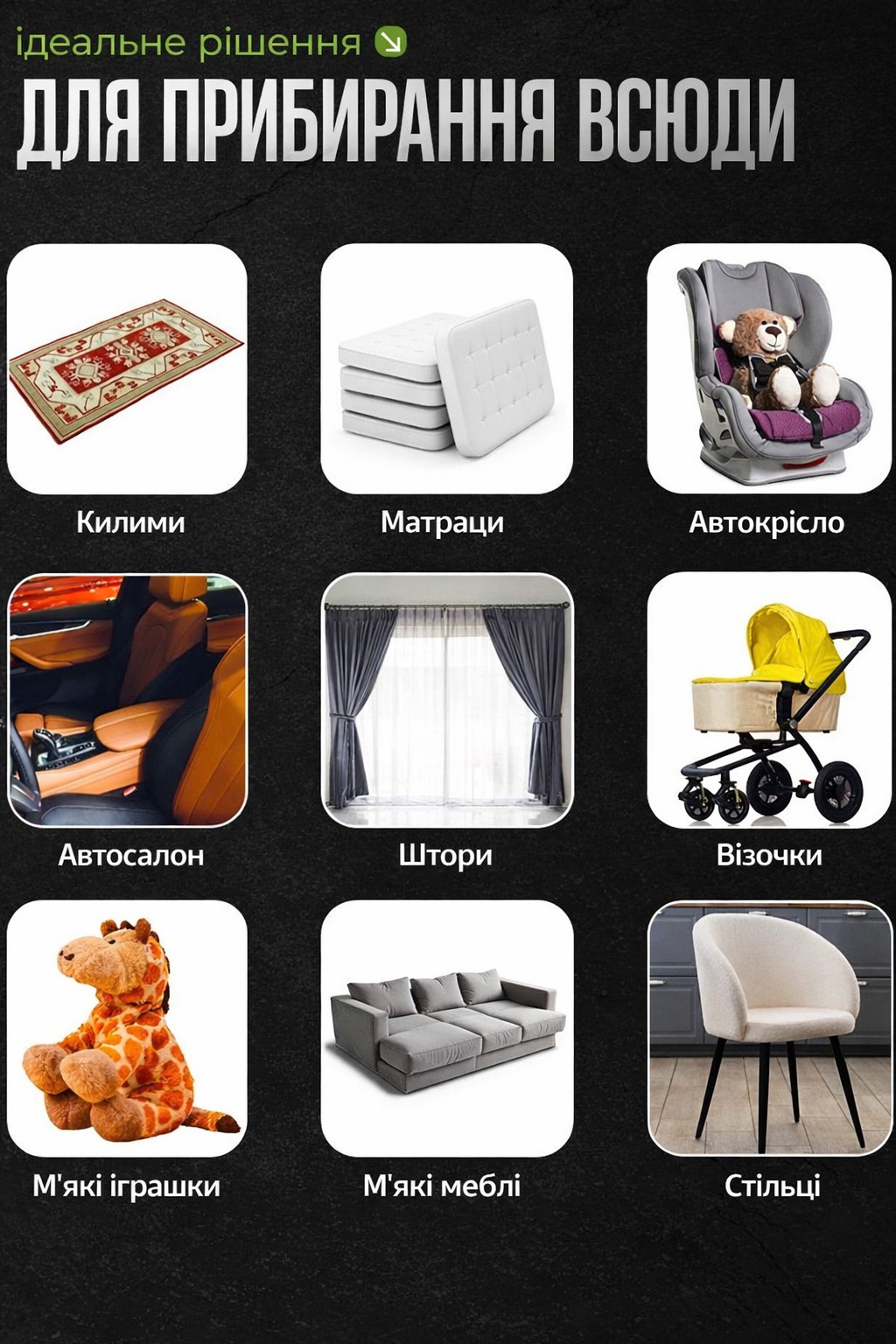 Пилосос ідеально підходить як для регулярного прибирання, так і для локального точкового чищення — диванів, крісел, килимових доріжок, оббивки та автомобільного салону. Технологія вологого прибирання освіжає поверхні, повертаючи їм чистоту та доглянутий вигляд.
