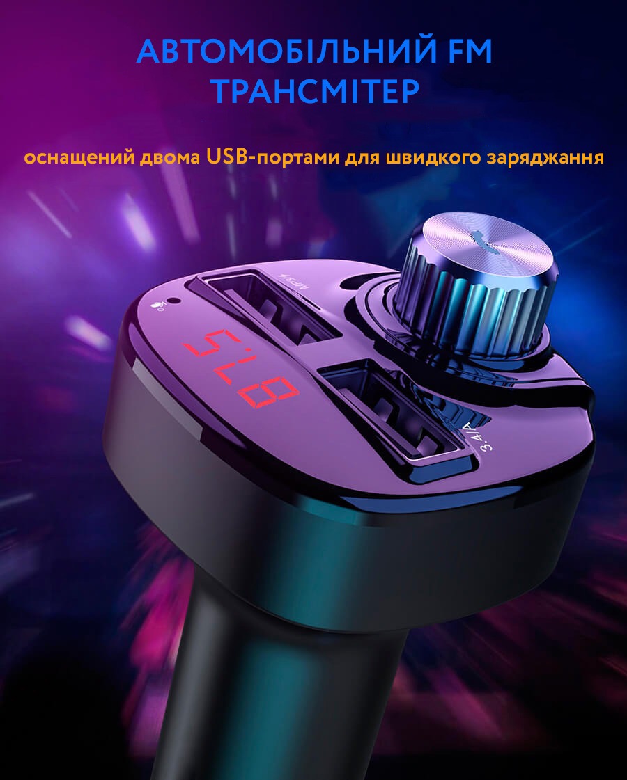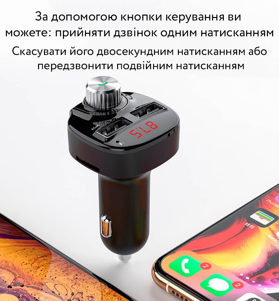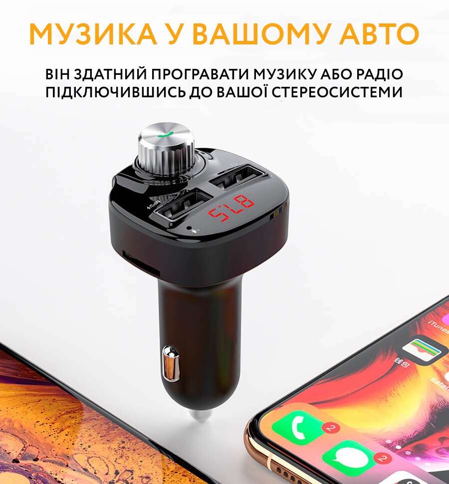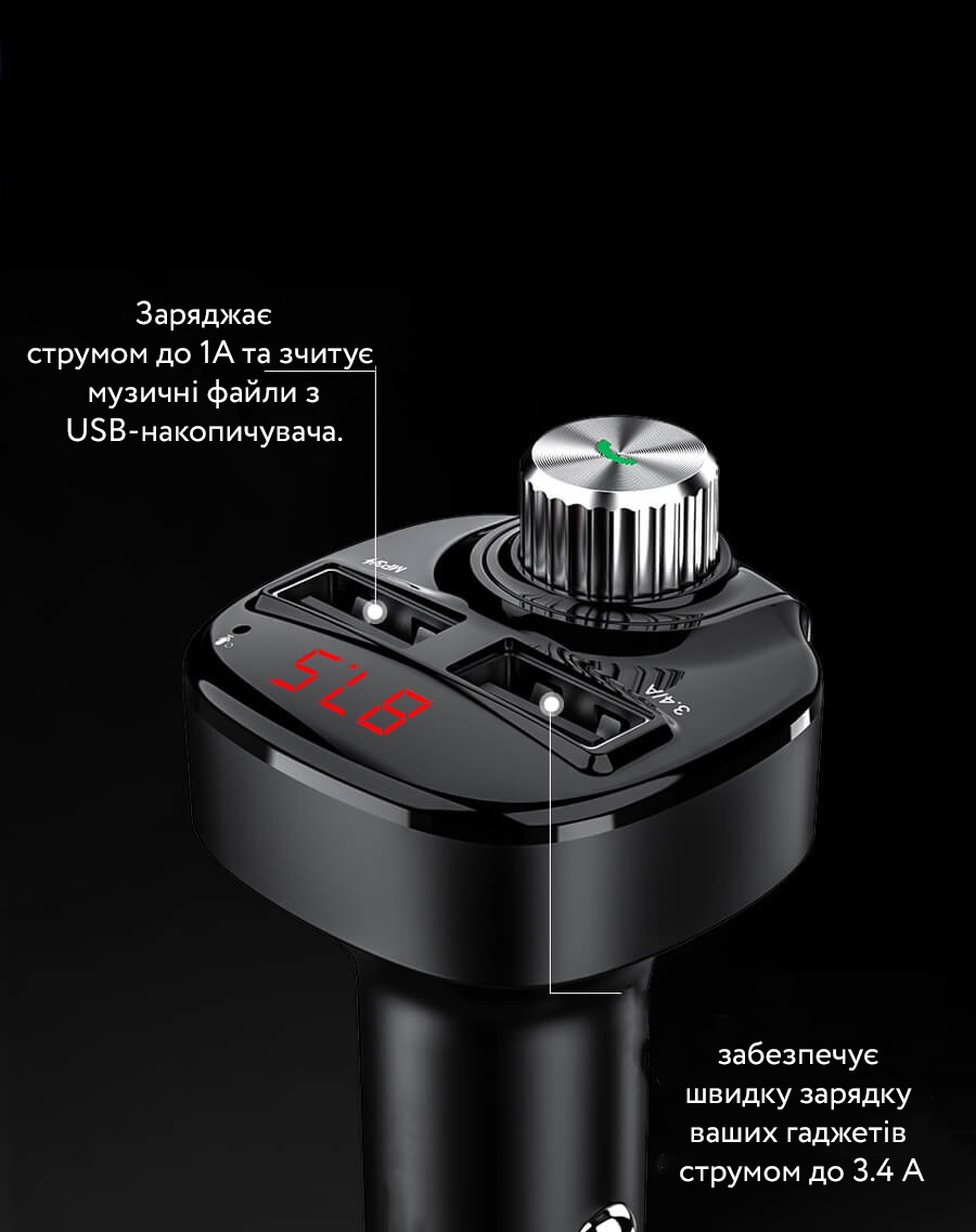 Автомобільний FM трансмітер з автозарядкою стане відмінним аксесуаром у машині. На додаток до можливості одночасної зарядки двох пристроїв через порт USB він здатний програвати музику або радіо підключившись до вашої стереосистеми. Для цього потрібно або підключити телефон Bluetooth, або вставити micro-SD/USB флешку в необхідний слот.