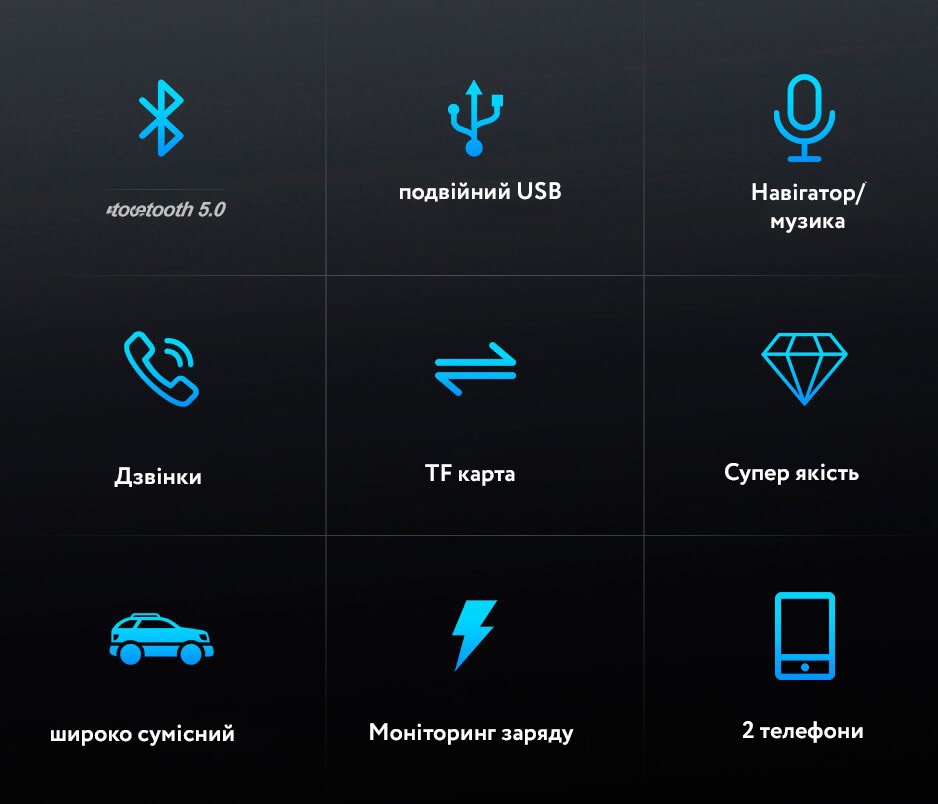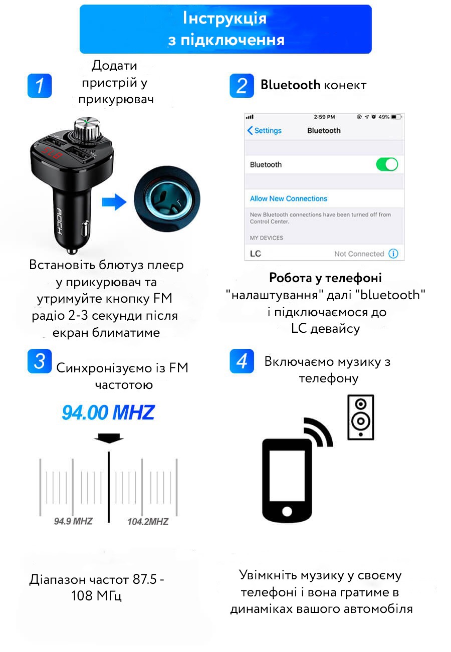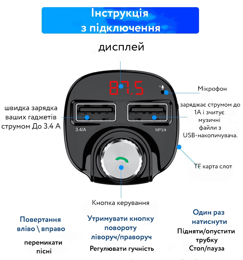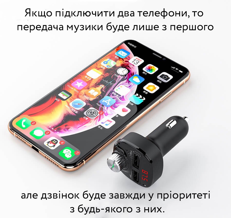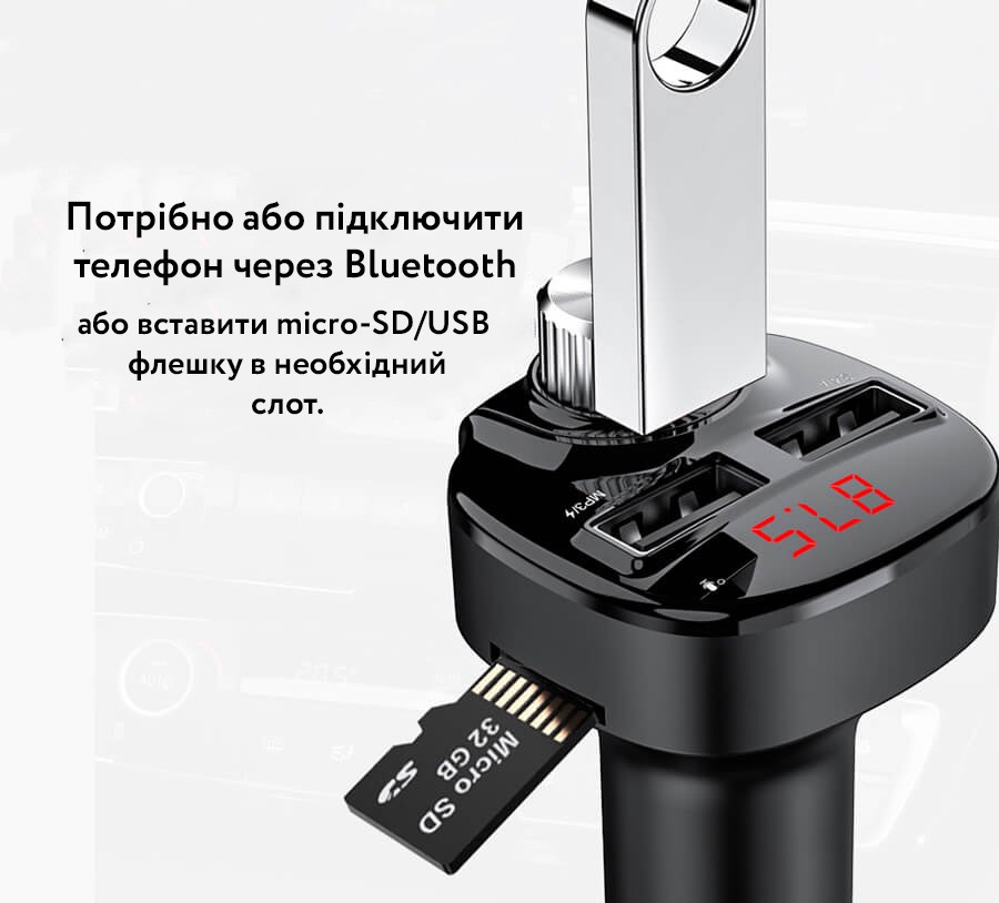 Автомобільний FM трансмітер з автозарядкою стане відмінним аксесуаром у машині. На додаток до можливості одночасної зарядки двох пристроїв через порт USB він здатний програвати музику або радіо підключившись до вашої стереосистеми. Для цього потрібно або підключити телефон Bluetooth, або вставити micro-SD/USB флешку в необхідний слот.