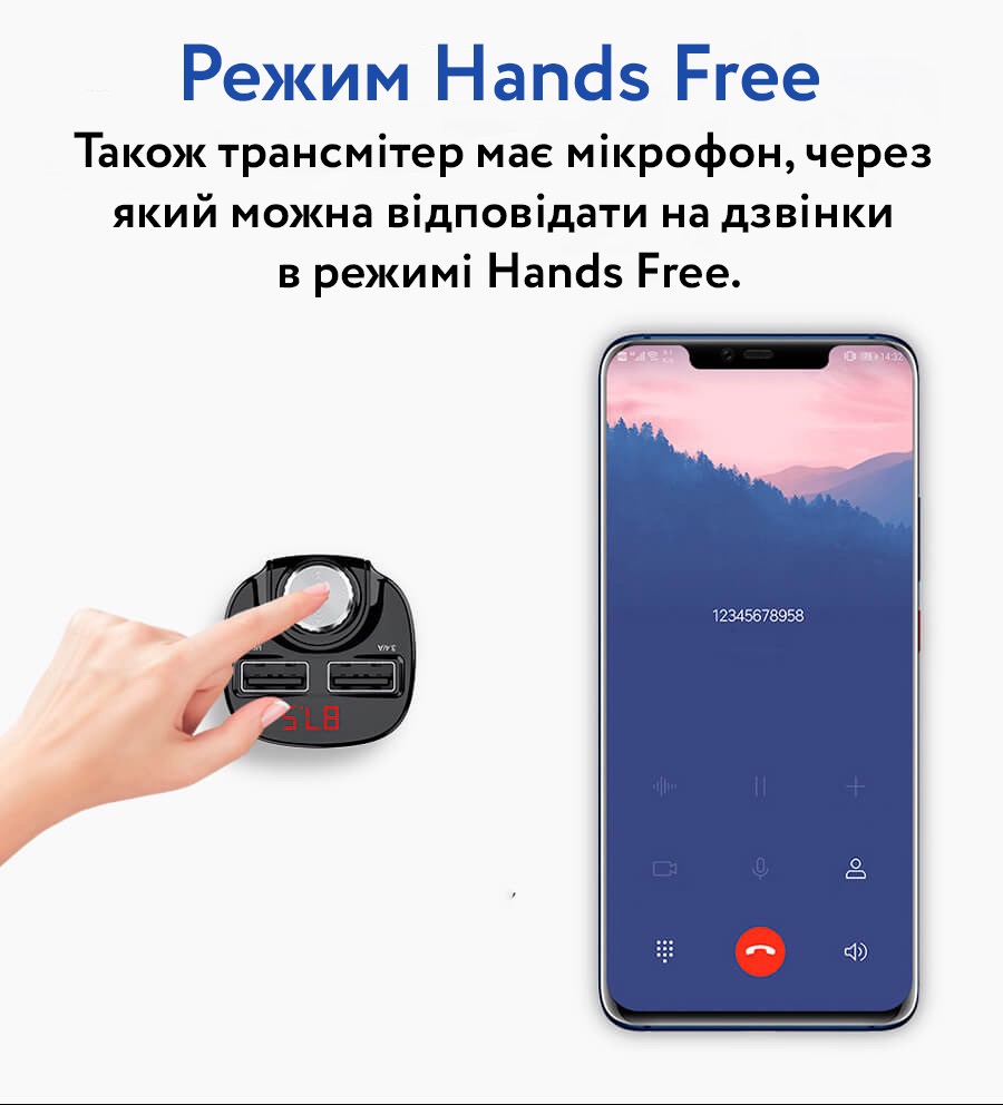 Також зарядка має мікрофон, через який можна відповідати на дзвінки в режимі Hands Free. Якщо підключити два телефони, то передача музики буде лише з першого, але дзвінок завжди буде в пріоритеті з будь-якого з них. За допомогою кнопки управління можна: прийняти дзвінок, скасувати його або передзвонити, налаштувати частоту радіо. LED дисплей відображає інформацію про частоту радіо та стан акумулятора. Цей зарядний пристрій має широку сумісність із різними автомобілями з діапазоном напруги 12-24V.
