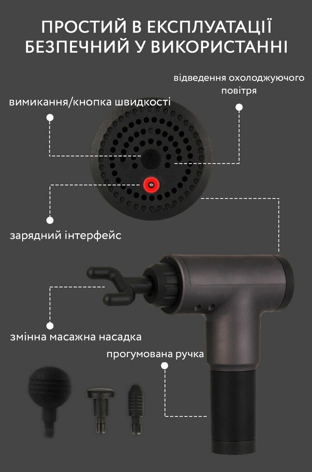 Масажер виконаний в ергономічній формі у вигляді пістолета, він комфортно сидить у руці, ним зручно користуватися. У комплекті є 4 насадки, для впливу на певні групи м'язів ніг, сідниць, спини, грудей, зап'ястя і кісточок. Оптимальна тривалість сеансу – 15 хвилин, працює від вбудованого акумулятора.Тип масажу: