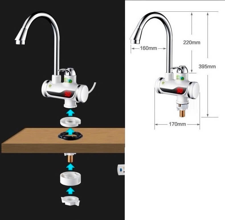 Для встановлення водонагрівача, не потрібно ніякого спеціального монтажу, або спеціальних знань, просто зніміть старий кран, та поставте кран-водонагрівач LCD. Проточний кран водонагрівач повертається на 360 градусів, тому його дуже зручно використовувати як у звичайній раковині, так і раковині з двома відділеннями. Корпус виготовлений з термостійкого пластику, тому водонагрівач прослужить довгі роки.