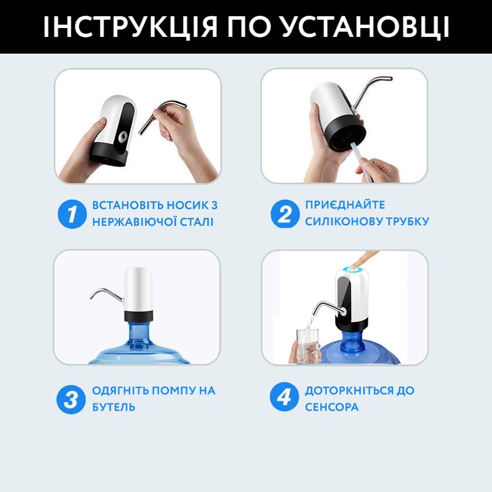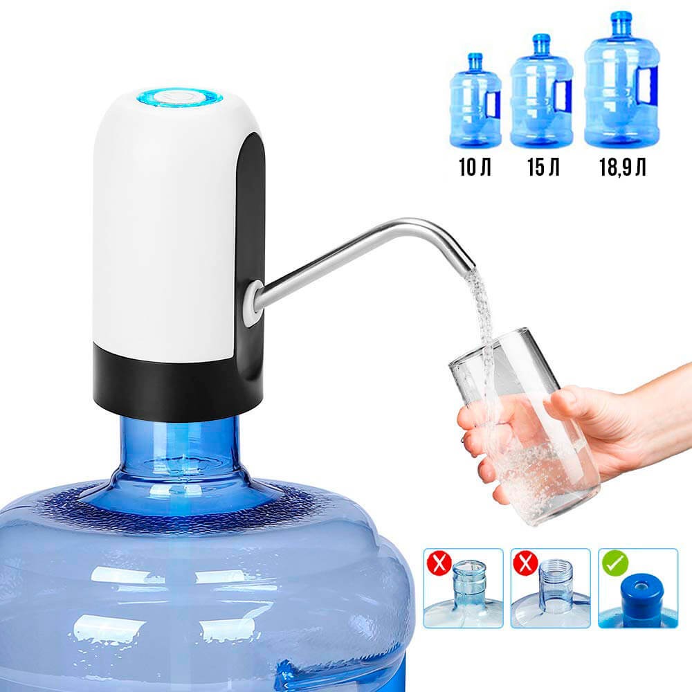 - Помпа сумісна з пляшками об'ємом 10, 15 і 18,9 літрів.