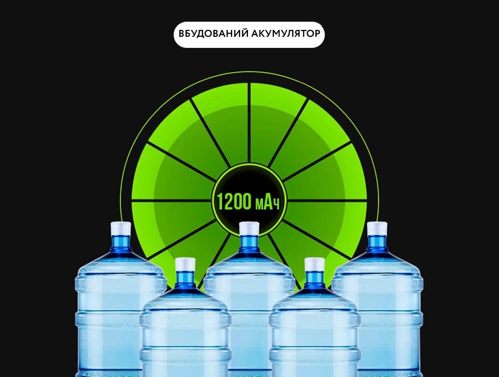 - Працює помповий насос від вбудованого акумулятора, ємності якого вистачить для перекачування 3-4 повних 18,9 літрових бутлів від одного заряду.