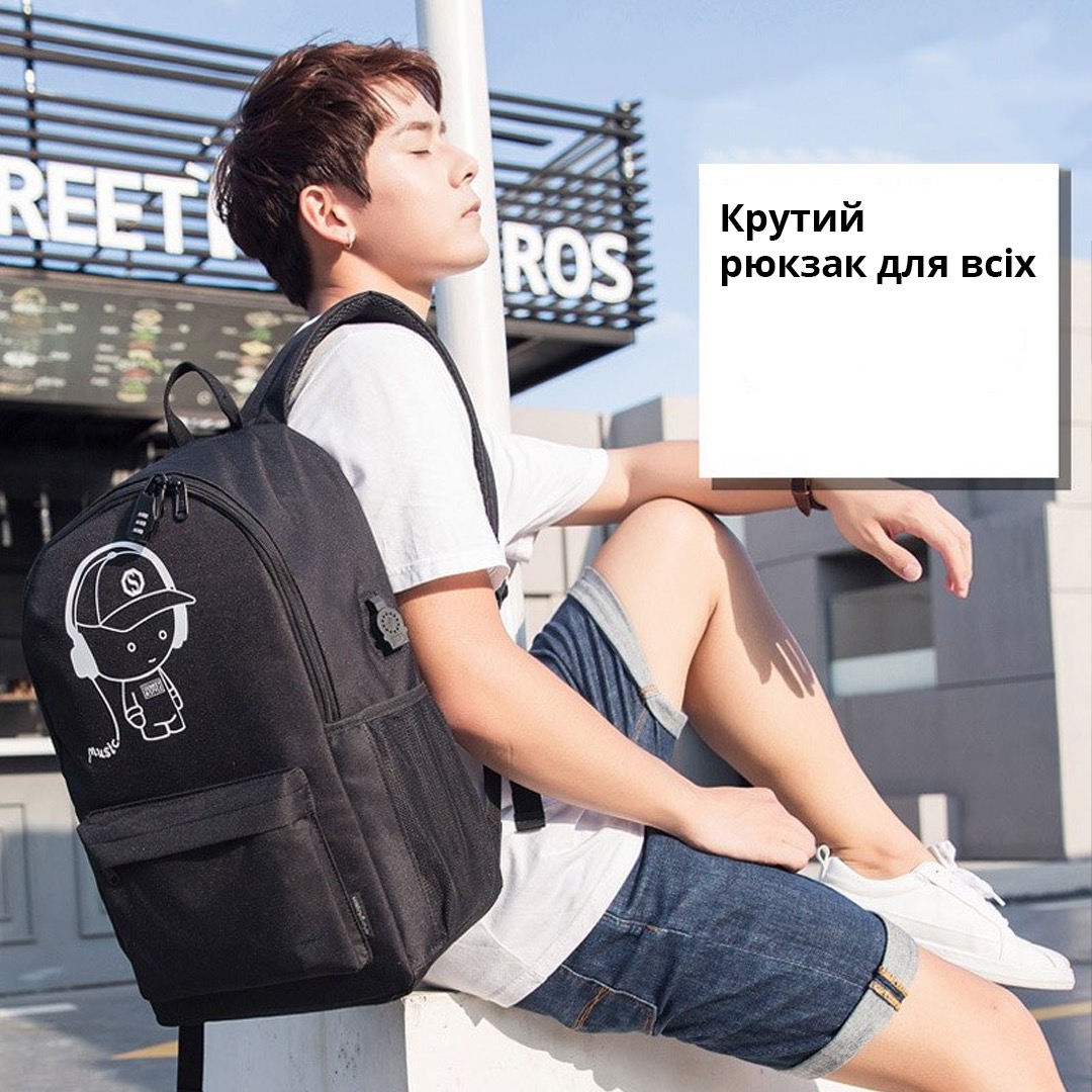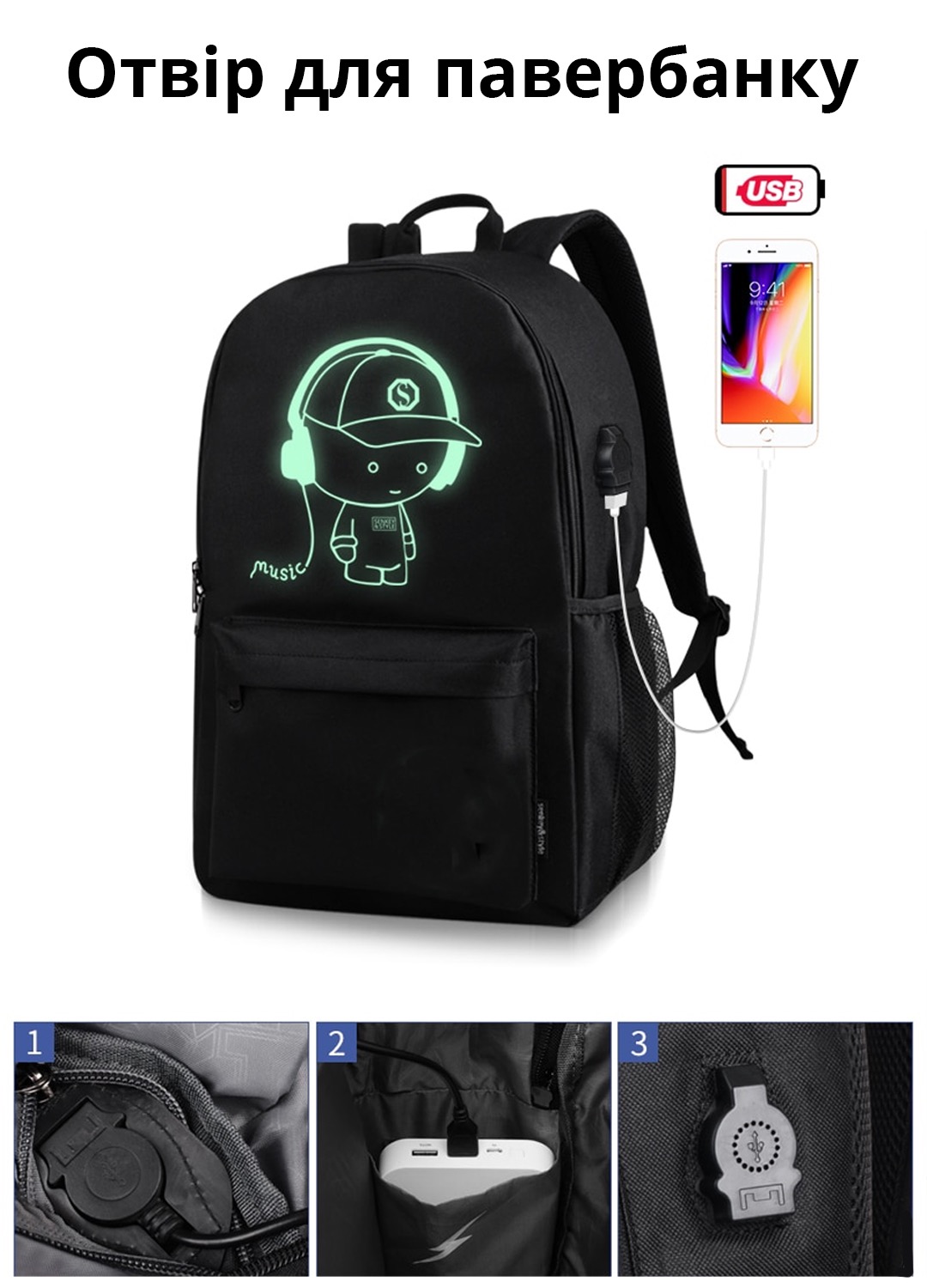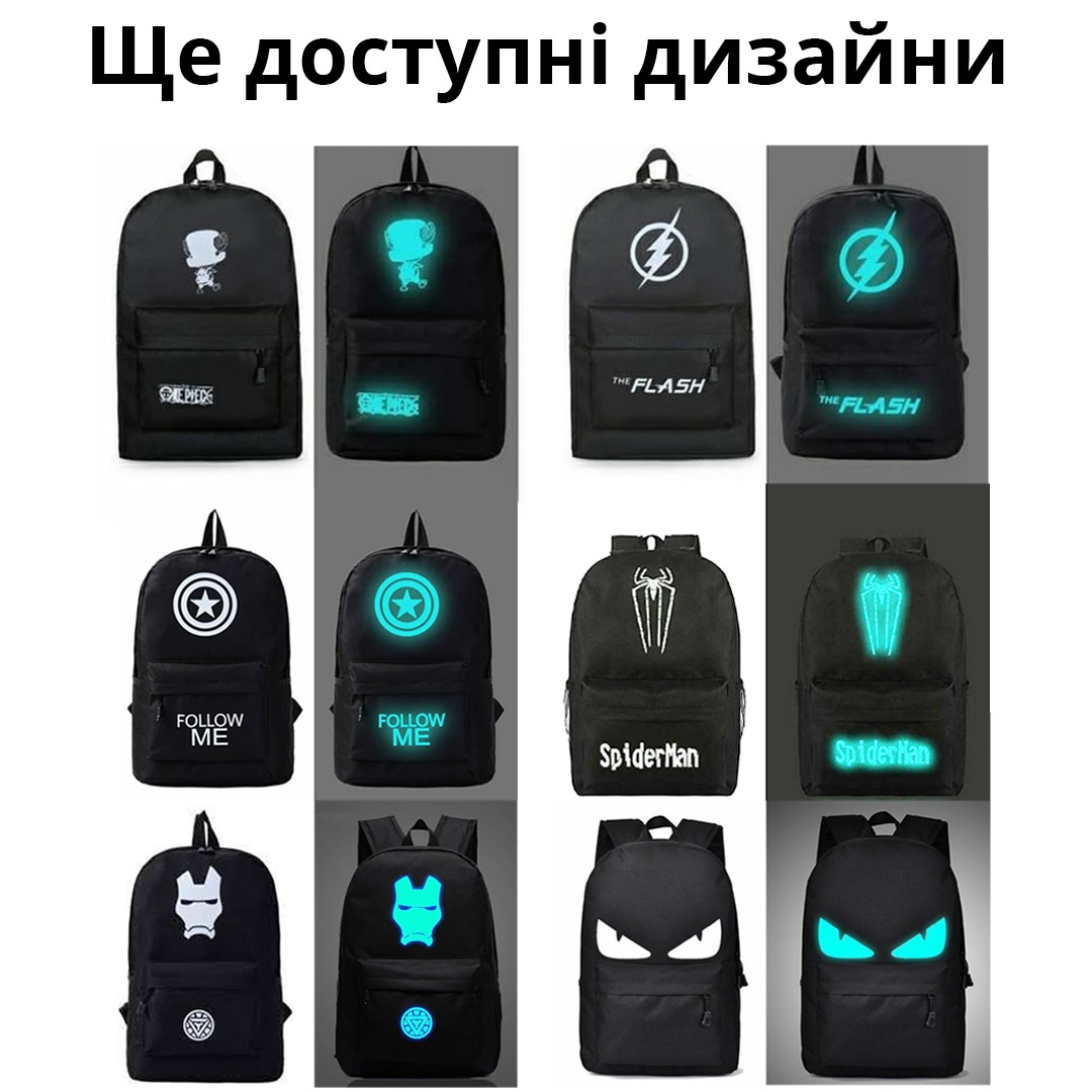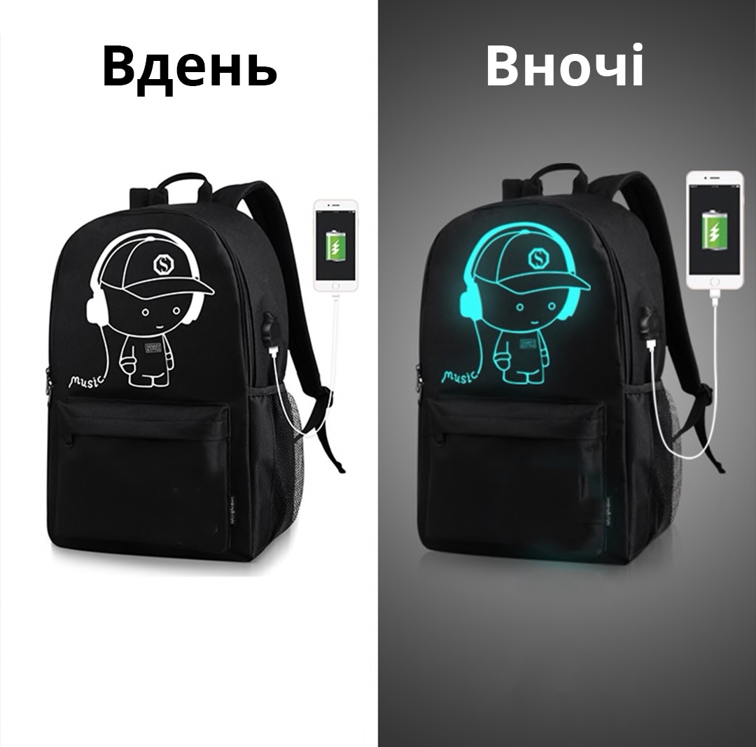 Зручний і стильний рюкзак порадує вас своєю якістю і функціональністю. Для того щоб рюкзак світився в темряві, потрібно його потримати на яскравому світлі зовсім недовго (5-10 хвилин) і він кілька годин (2-4) буде світитися в темряві. Флуоресцентні принти, нанесені на рюкзак, є нешкідливими і безпечними для Вашого здоров'я. У денний час цей рюкзак чорного кольору з білим малюнком, але вимкніть світло - він почне виділяти флуоресцентне світло.