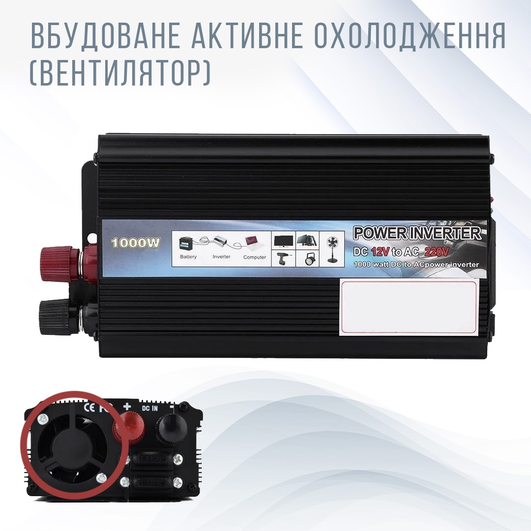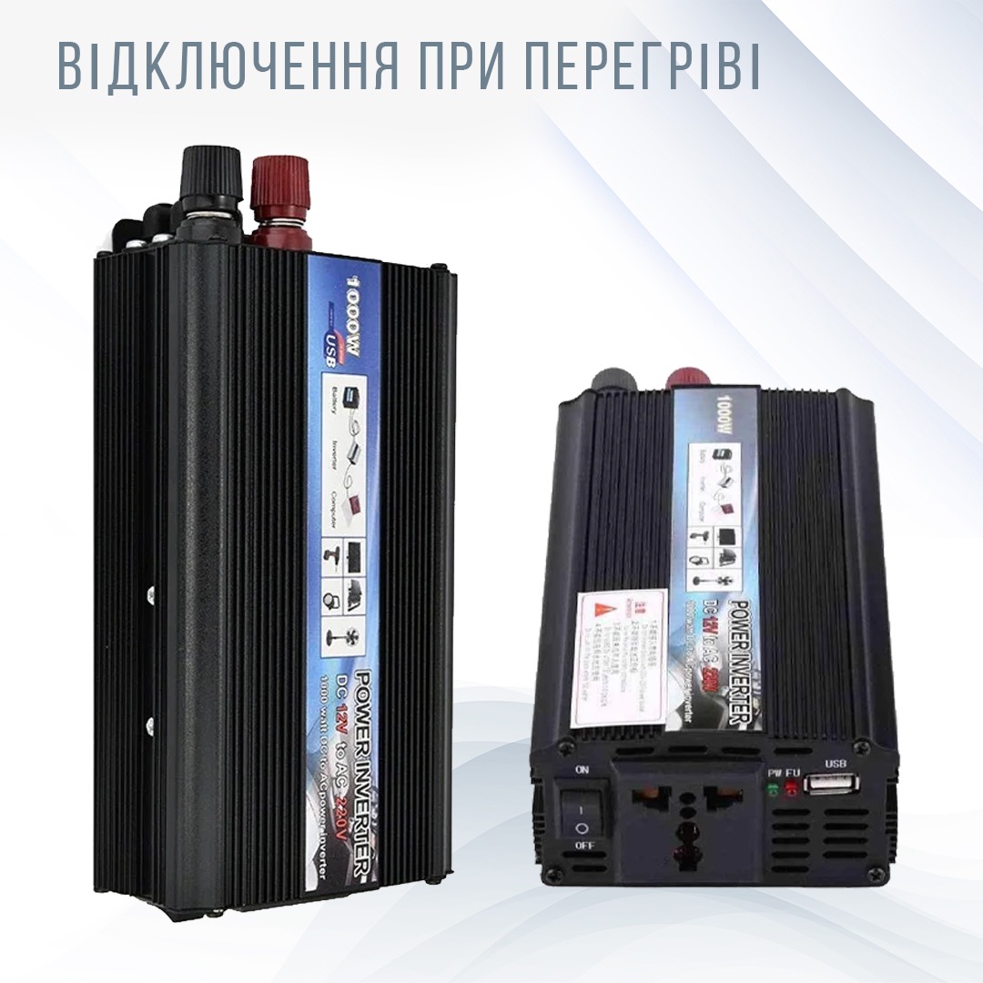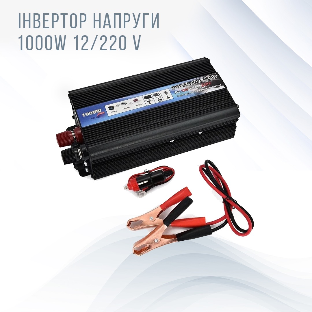 Автомобільний перетворювач напруги 12V-220V потужністю 1000W - пристрій, призначений для підключення і використання різноманітної побутової техніки, електроінструменту, ноутбука, телефону, різної відео- та аудіотехніки, а також інших електроприладів в умовах, де немає мережевих джерел живлення. Наприклад, в подорожах на автомобілі, прогулянках на катері, в гаражі, на дачі і в аварійних ситуаціях. Як джерело напруги 12V можуть застосовуватися акумулятори автомобіля, вітрові та сонячні генератори.