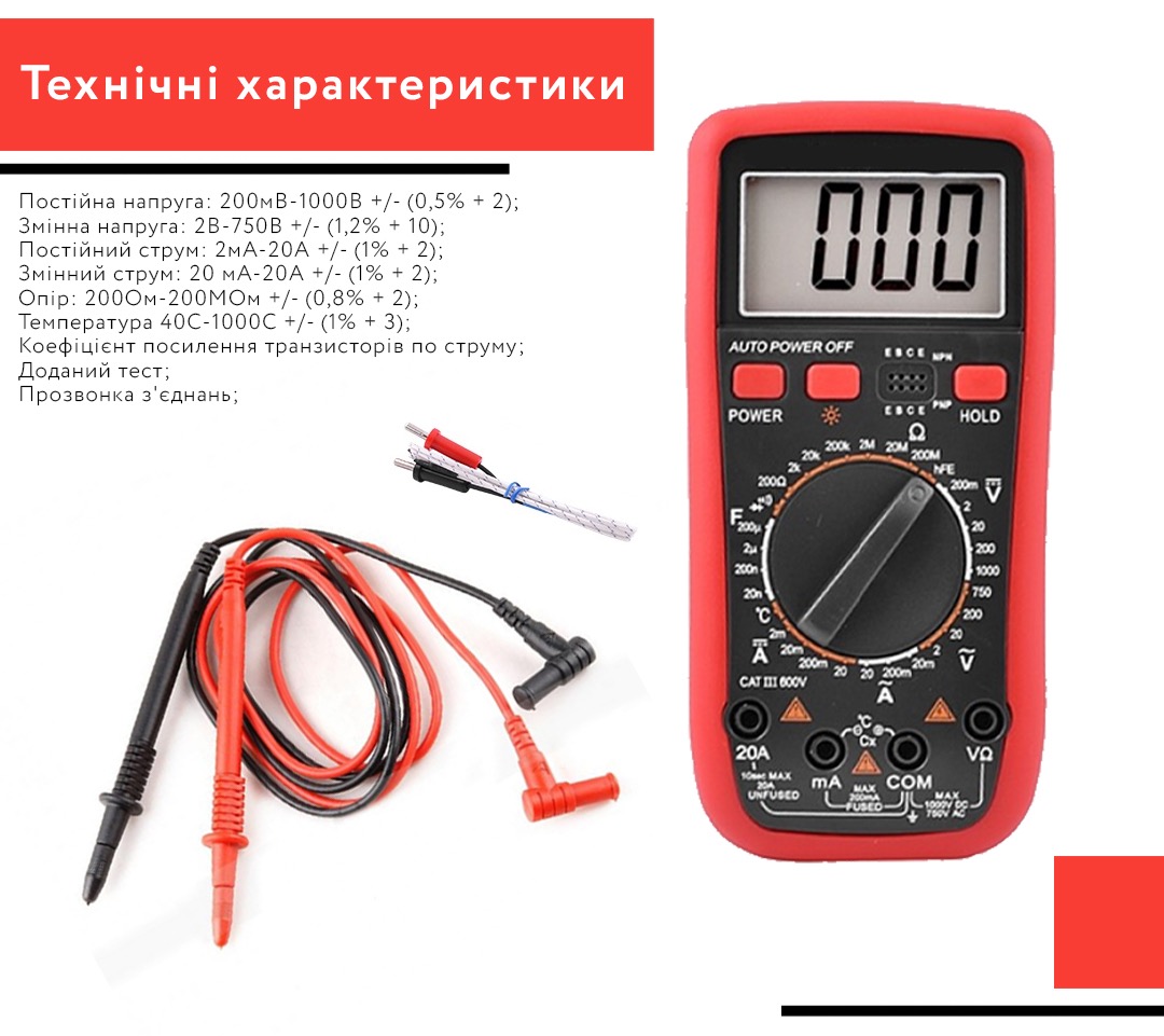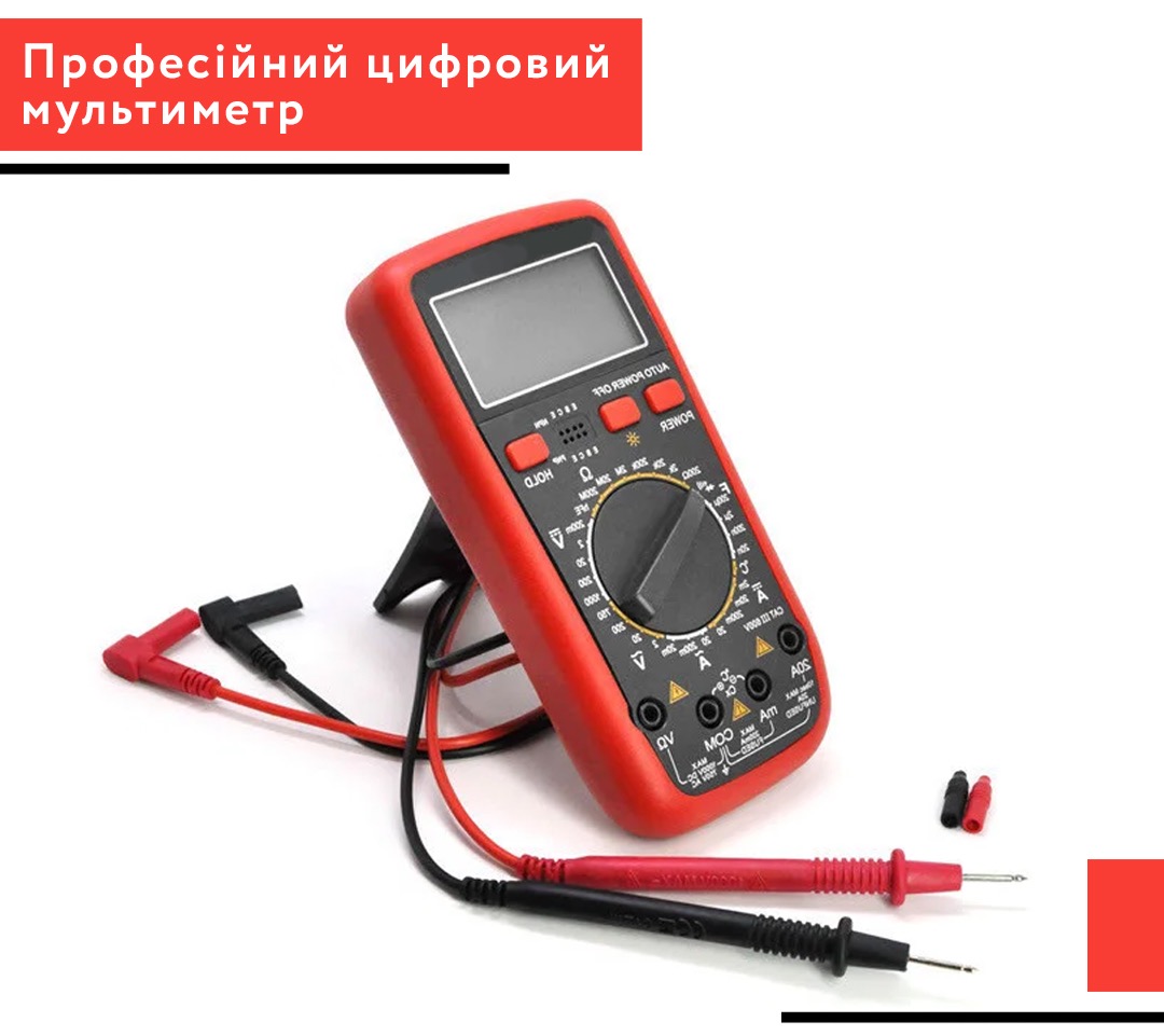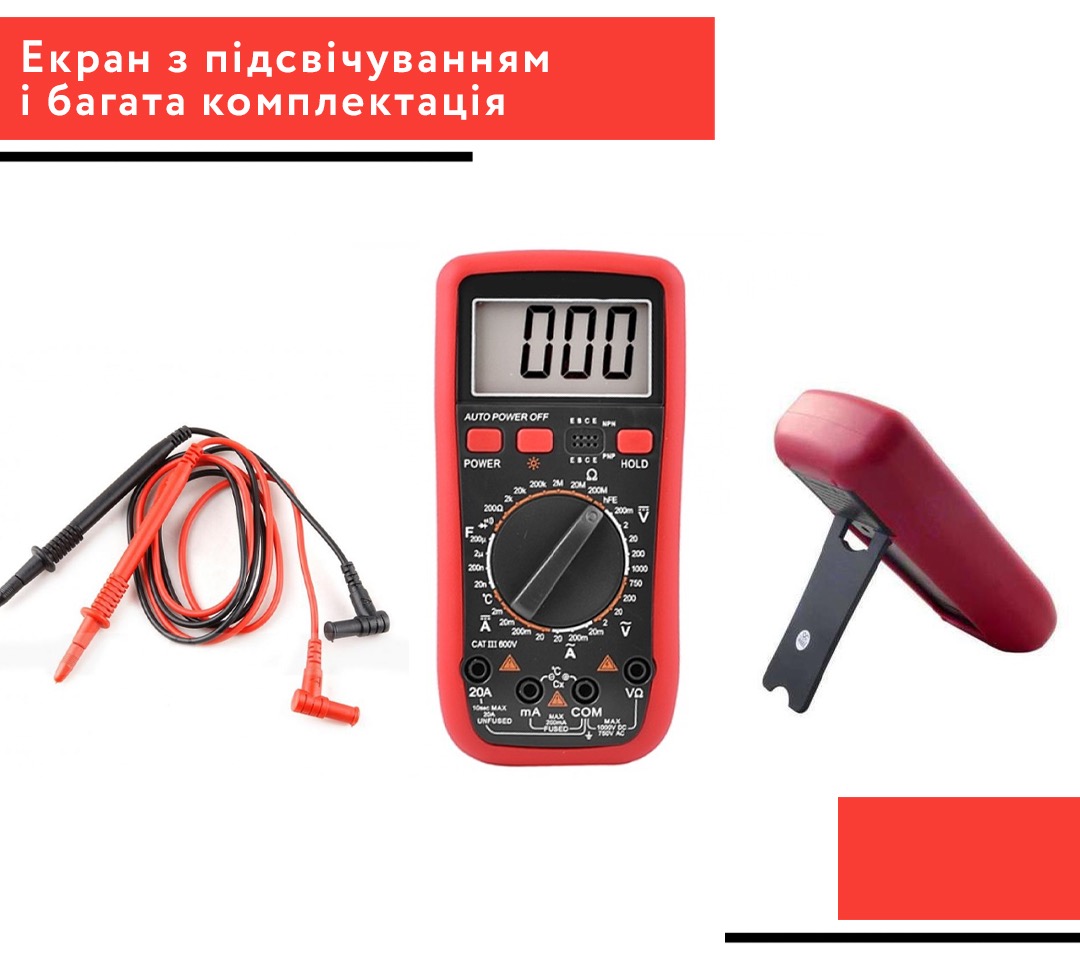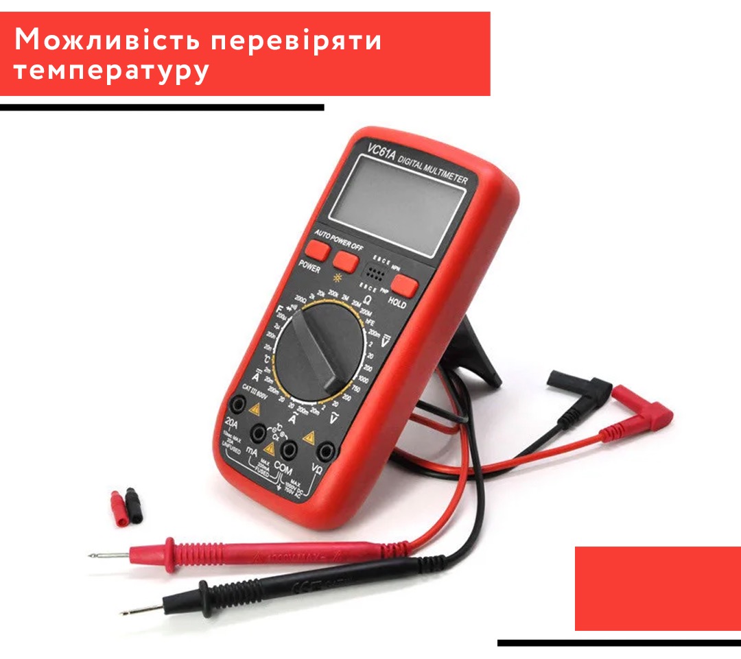 Цифровий мультиметр VC61A призначений для вимірювання опору, постійного і змінного струмів, прозвонки, вимірювання ємностей, температури. Головні відмінності від більш дешевих аналогів: прогумований корпус, біле підсвічування, великий екран, якість щупів і проводів помітно поліпшено.