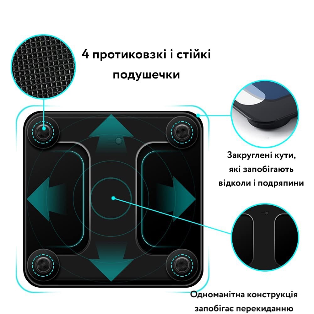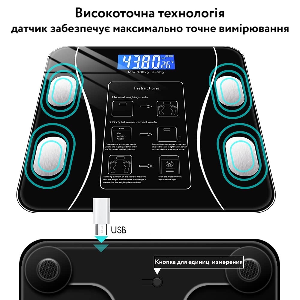 Розумна вага вимірює 12 основних показників вашого тіла, включаючи вагу, індекс маси тіла, % жиру в організмі, % води, вісцеральний жир, вік тіла, м'язову масу, кісткову масу, білок, масу тіла без жиру, рівні ожиріння, основний метаболізм. Ці дані синхронізуються з додатком після його встановлення на ваш смартфон під керуванням Android або iOS. Чіткий графік тенденцій дозволяє легко відстежувати прогрес на екрані смартфона і зберігати мотивацію на шляху до ідеального тіла.