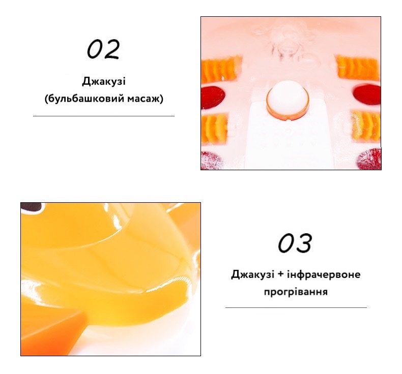 Масажна ванна для ніг із високою температурою дає ногам заспокійливий масаж, а ефект джакузі – повну релаксацію. Ролики забезпечують ніжний масаж ніг, а тепло додатково розслаблює ноги. Представляє собою пластмасову ємність, прикриту з одного боку козирком, що захищає навколишній простір від бризок. Прилад оснащений спеціальними роликами-насадками, які легко регулюються за допомогою кнопок або спеціального перемикача.
