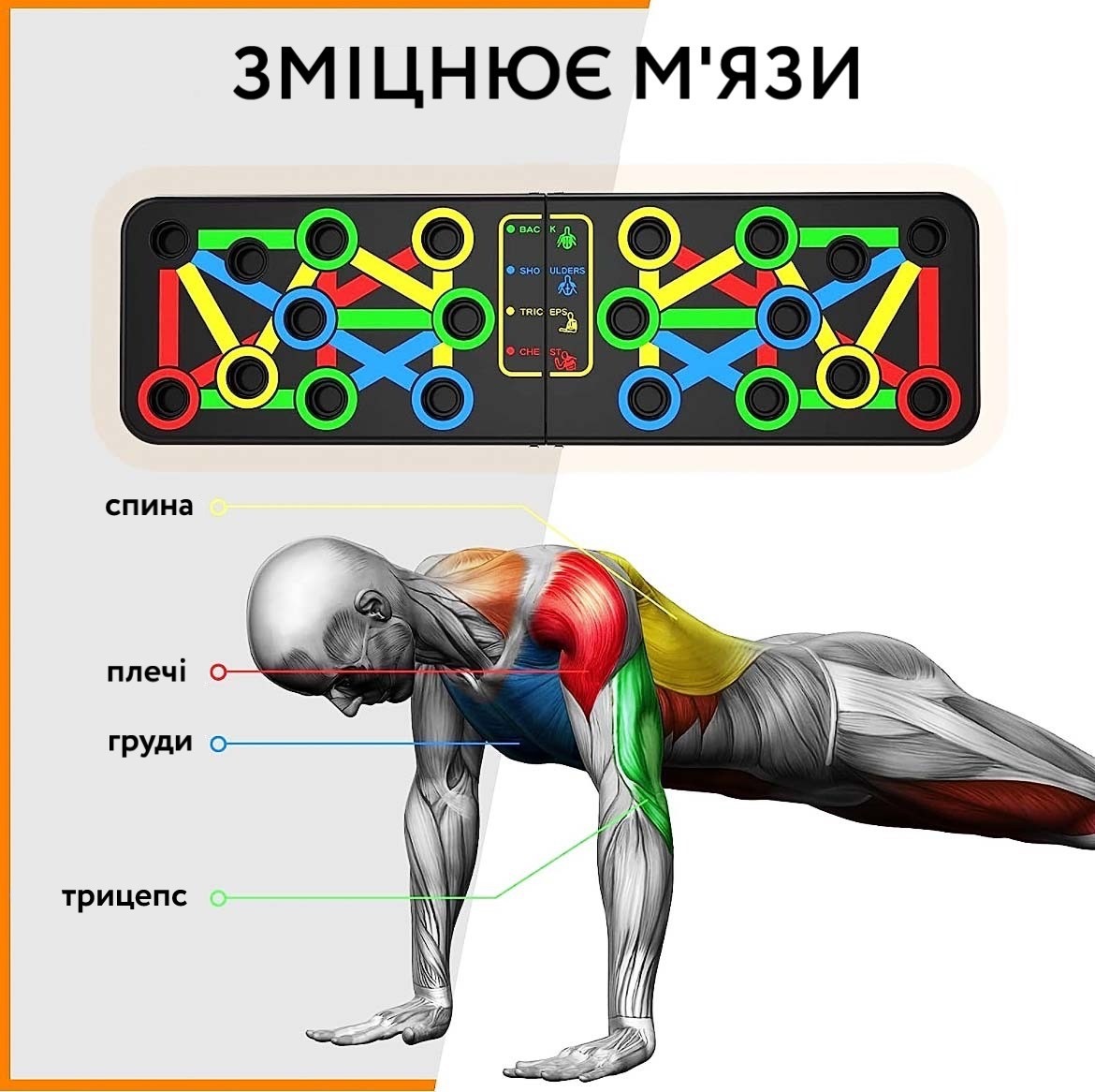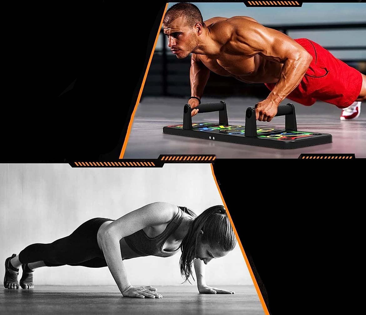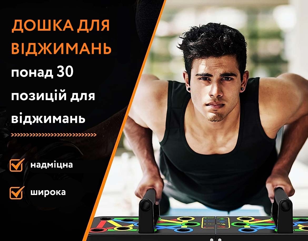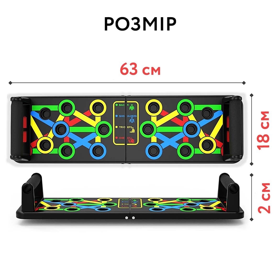 Спортивна дошка з упорами для віджимань, розмічена за спеціальною системою вправ на різні групи м'язів та зон торсу – плечі, спину, руки, груди. Упори дозволяють опускати тіло нижче, ніж при звичайних віджиманнях - це створює ширшу амплітуду, що, у свою чергу, дозволяє пропрацювати м'язи набагато ефективніше.