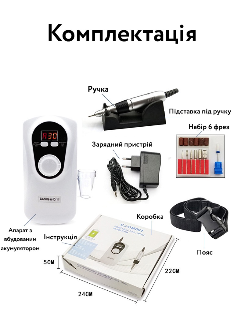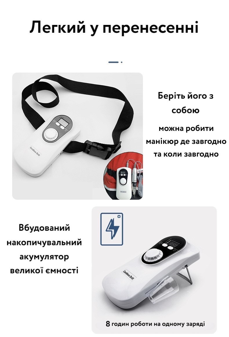 Чудовий апарат для майстрів, що працюють вдома або на виїзді, Потужний акумулятор 2600 mAh без мережі протягом тривалого часу. Чохол на пояс для комфортної процедури – застосовується як тримач фрезера ручки із системним блоком завжди поряд з вами. Матеріал ручки металевий, вага складає 150 грам. Апарат із РК-дисплеєм для контролю швидкості та заряду батареї. Максимальне обертання 30000 оборотів за хвилину, потужність 30 вт, наявність реверсу та відмінне самоохолодження.