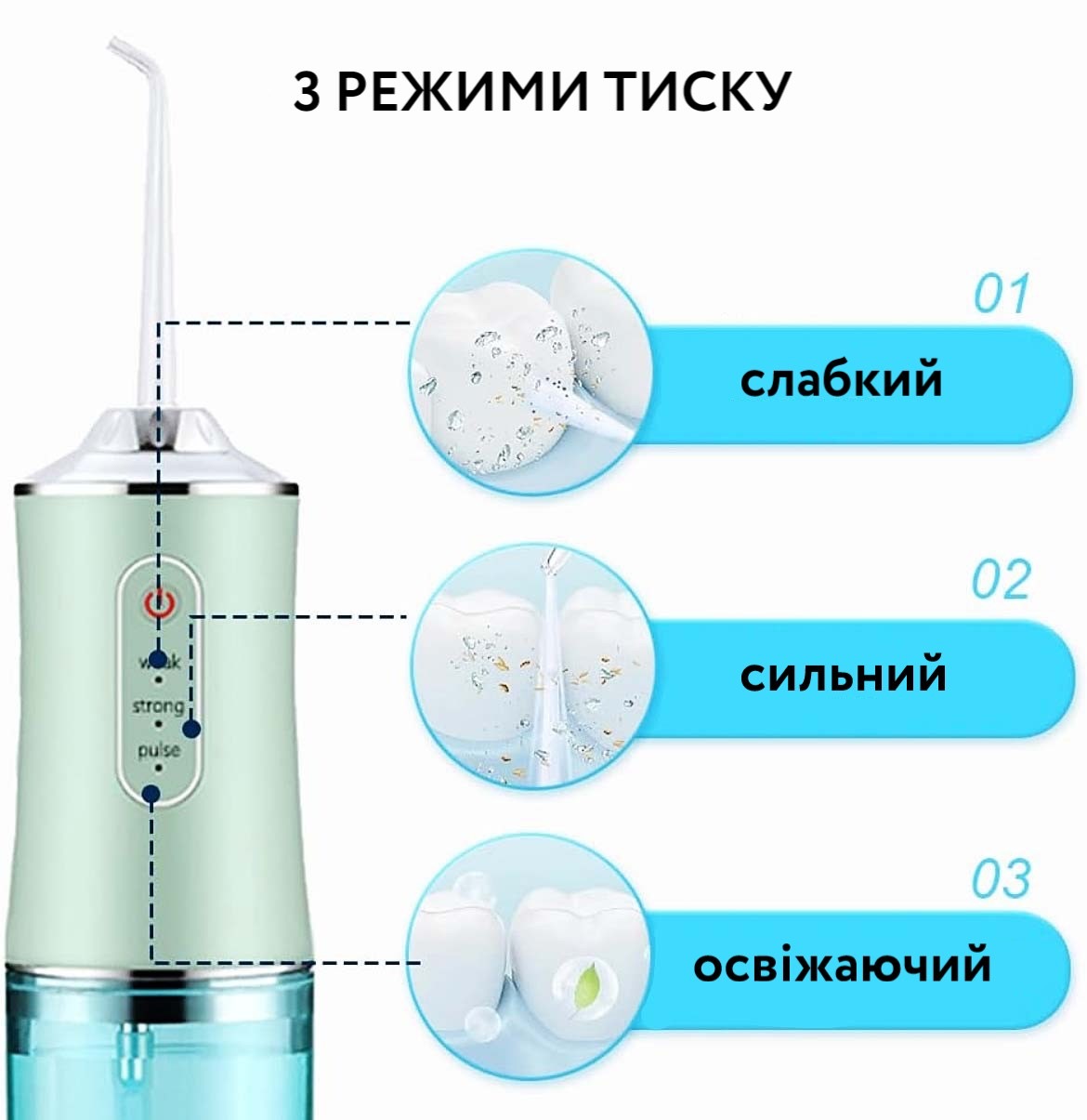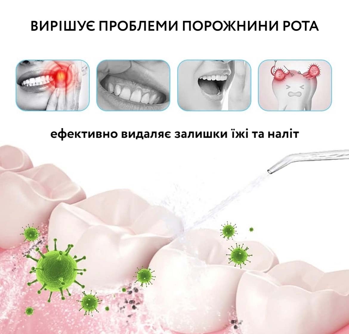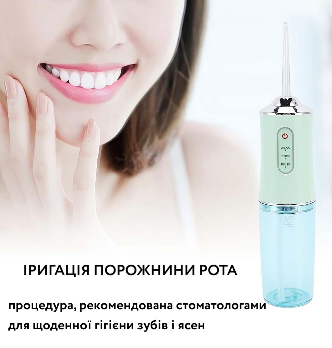 Щоденна гігієна порожнини рота. Іригатор працює за принципом гідромасажної дії: спрямований пульсуючий струмінь води забезпечує глибоке очищення в місцях, недоступних для зубної щітки, а також дбайливо зміцнює ясна.