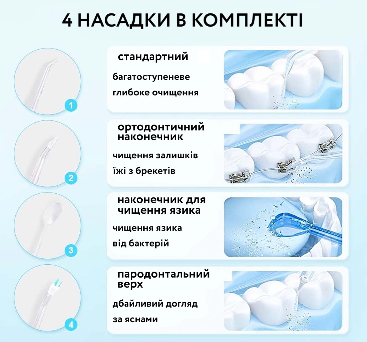 - Добре підходить для догляду за брекет-системами, протезами, імплантами, мостами;